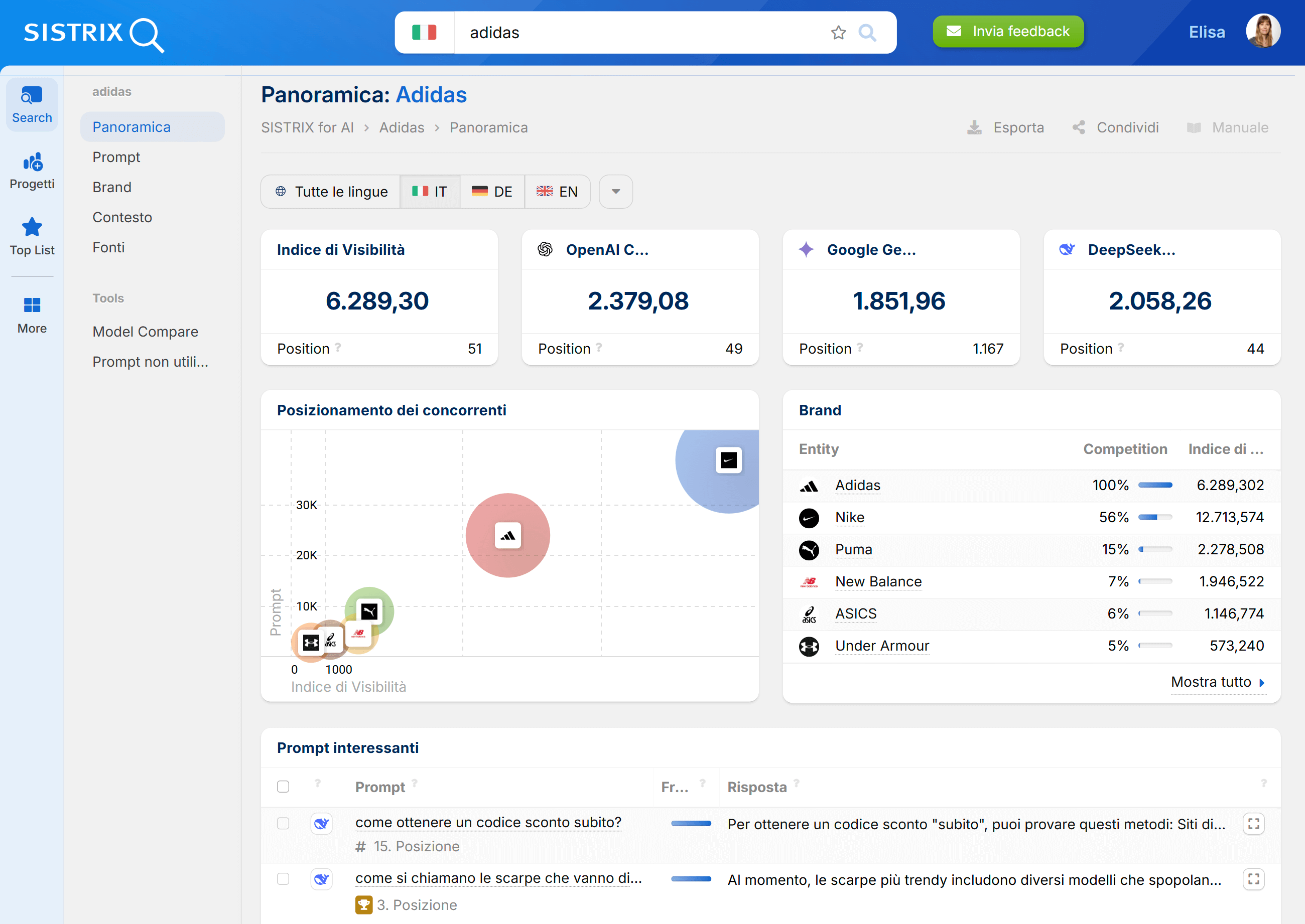 Il nuovo tool AI di SISTRIX fornisce un database affidabile ed esclusivo sulla visibilità dei brand nei Chatbot come ChatGPT, Gemini o Perplexity, comprese le analisi di Prompt specifici, concorrenti ed Environment. Testa SISTRIX gratuitamente per 7 giorni e scopri come si comporta il tuo brand nei più importanti sistemi di AI.