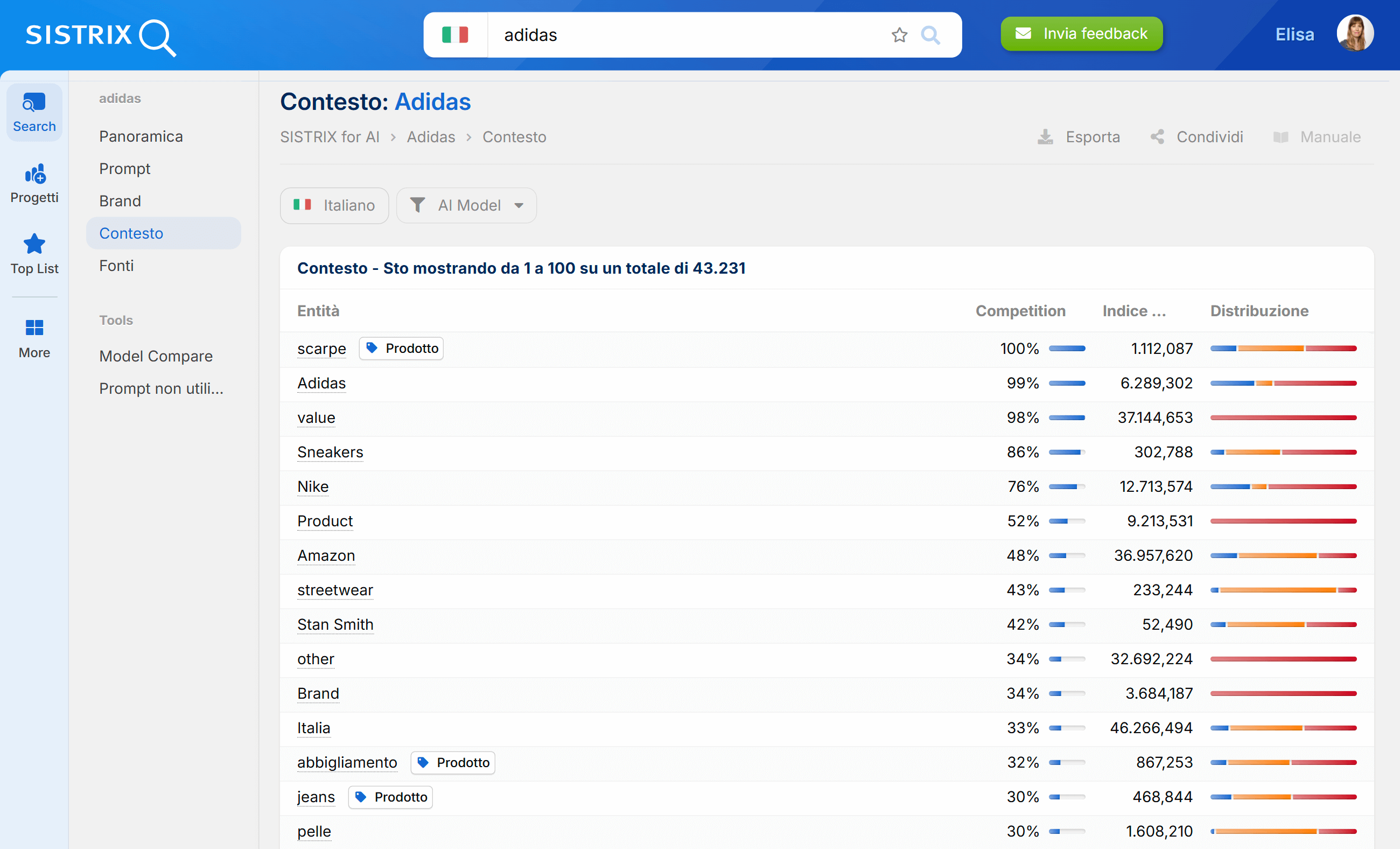 Nelle risposte degli LLM riconosciamo entità come brand, persone, luoghi e le fonti corrispondenti. In modo simile a “SISTRIX per Google” e “SISTRIX per Amazon”, i dati estrapolati permettono poi di effettuare una ricerca a ritroso: in quali Prompt viene citato un brand o quello di un concorrente? Quanto è visibile?