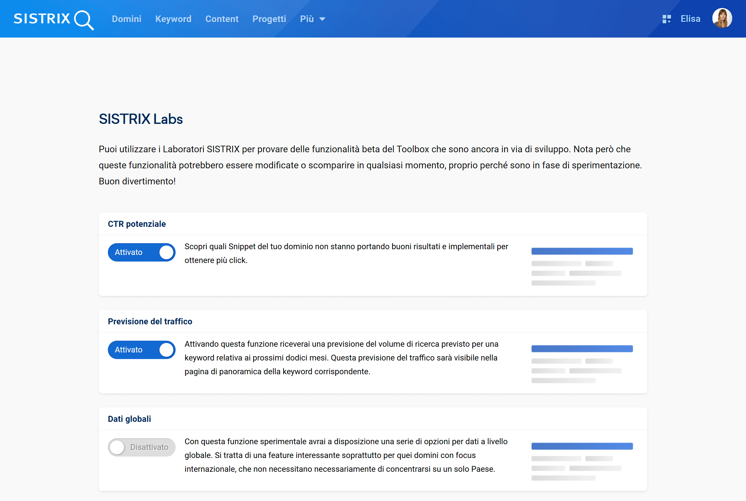 Funzioni in Labs: Su SISTRIX Labs vengono regolarmente messe a disposizione funzioni nuove o sperimentali attivabili manualmente e rivolte a tutti coloro che le vogliono testare in una fase iniziale. Alcune funzioni vengono inserite nel prodotto in un secondo momento, altre rimangono estensioni opzionali. Le nuove includono:
