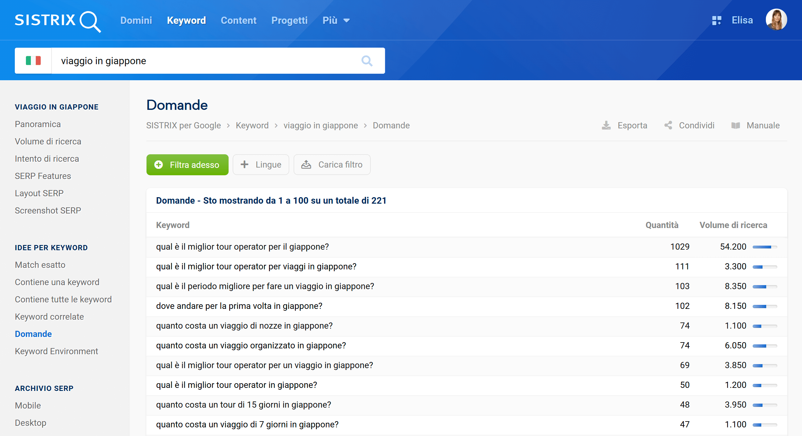 La sezione “Domande” (contenuta in “Idee per keyword“) mostra le query di ricerca di Google che contengono sia la keyword cercata nella barra di ricerca, sia le tipiche domande (cosa, come, quando, dove, ecc.): un ottimo modo per facilitare la comprensione dell’intento di ricerca delle keyword.