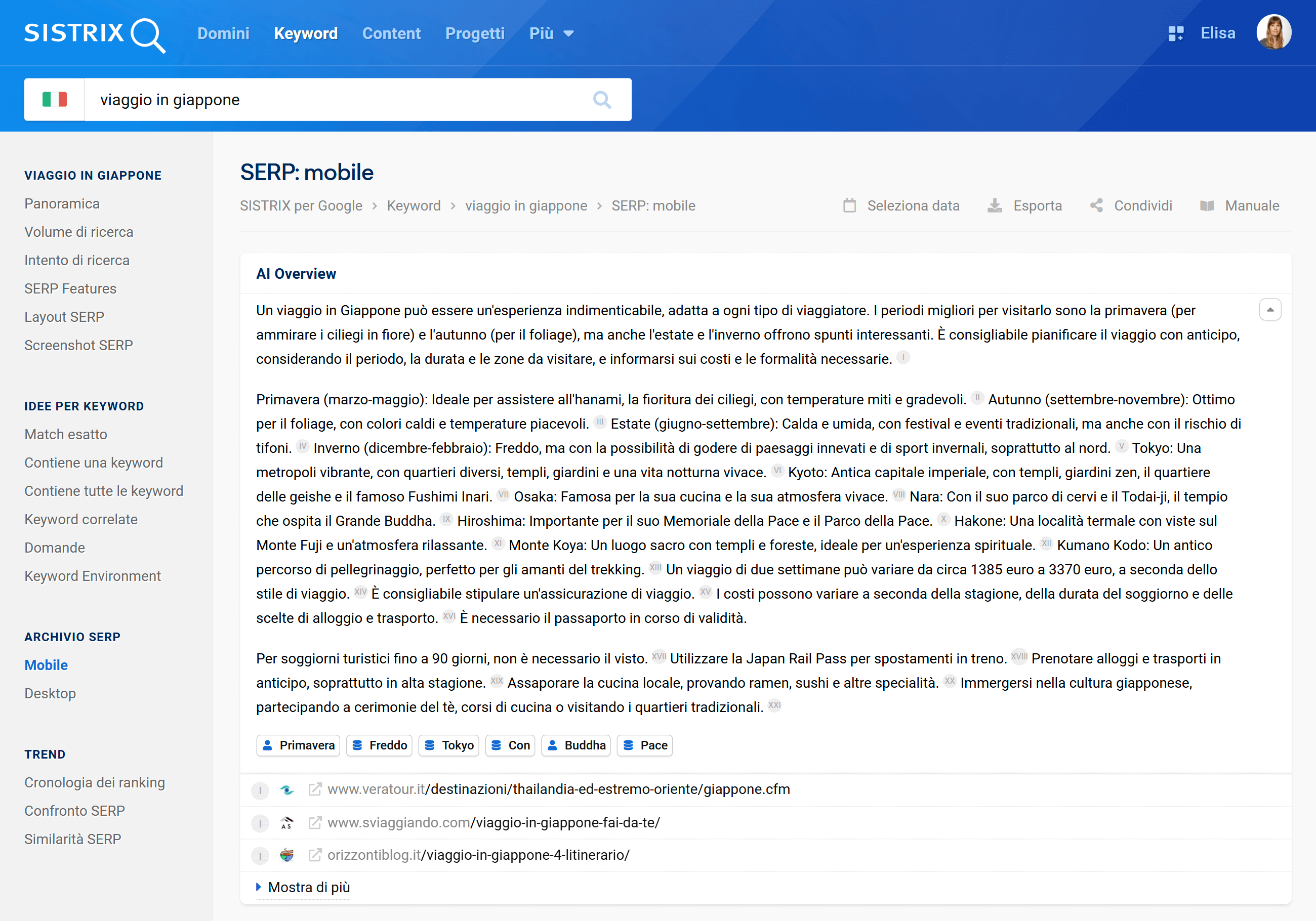 Infine, abbiamo ampliato la voce “Archivio SERP“: per ogni keyword si ha ora accesso all’intero contenuto dell’AI Overview, compreso il testo e tutti i riferimenti alle fonti (cioè agli URL collegati). SISTRIX riconosce anche le entità nominate nel testo della risposta, cioè le persone, i brand e i concetti citati.