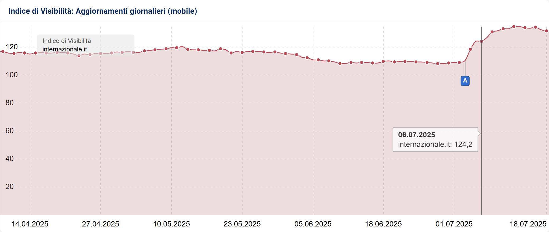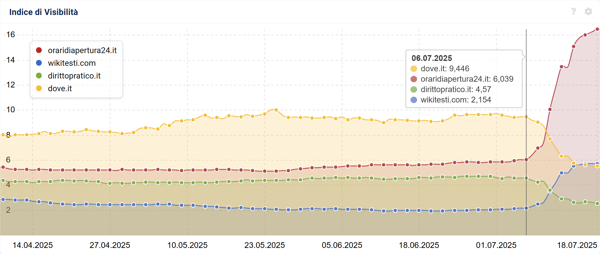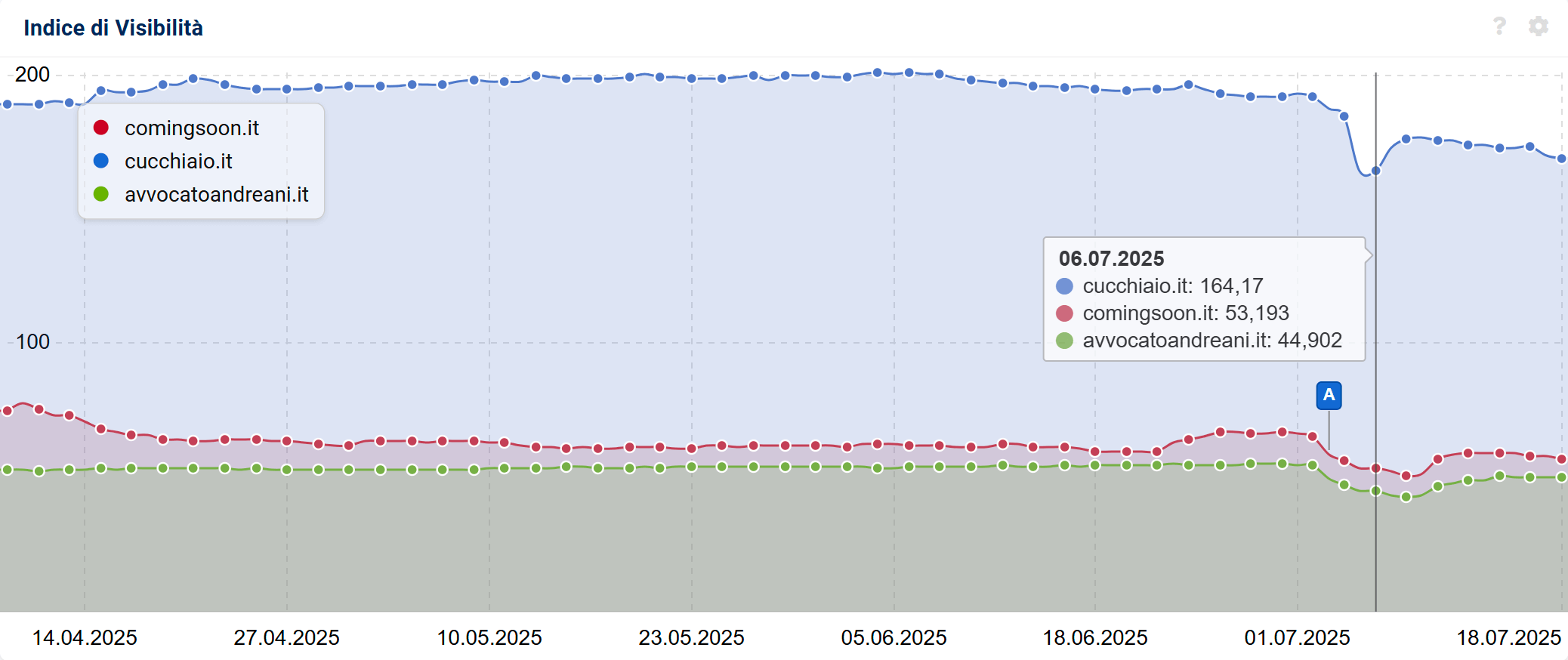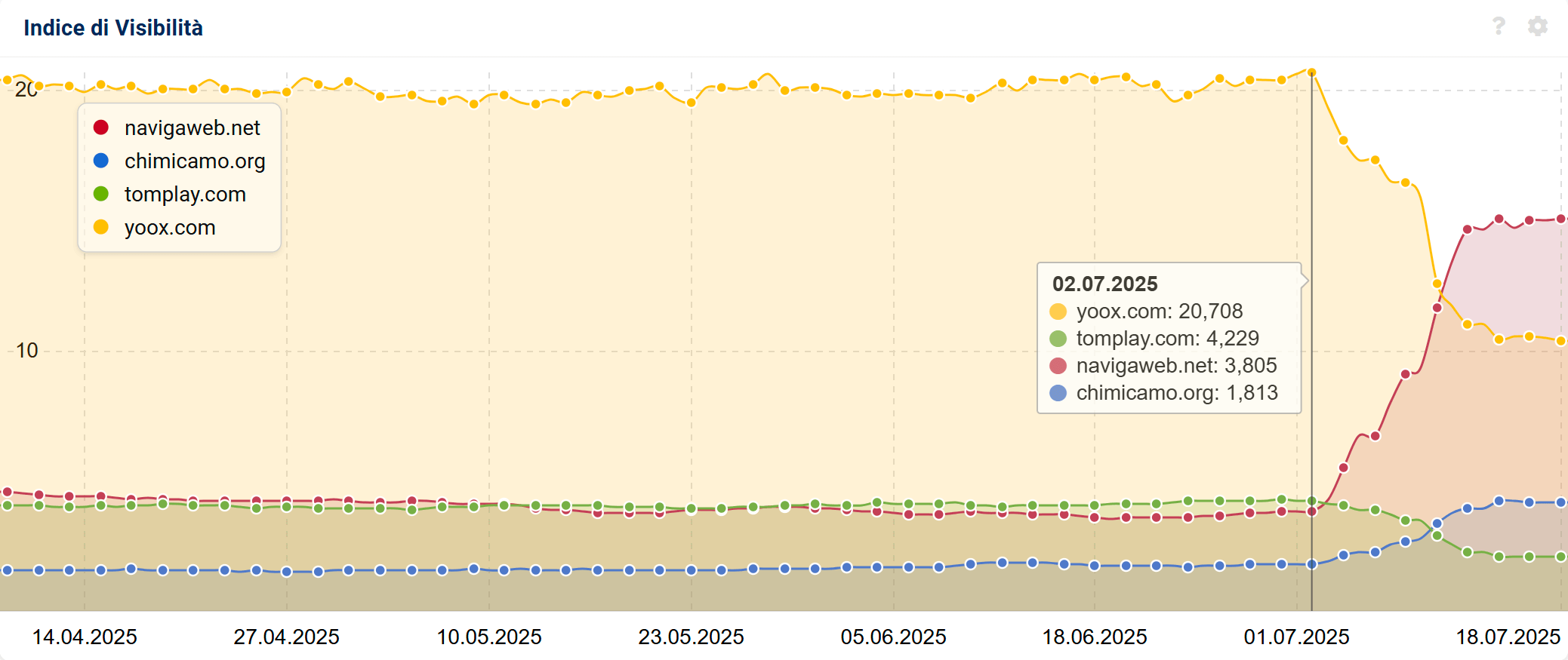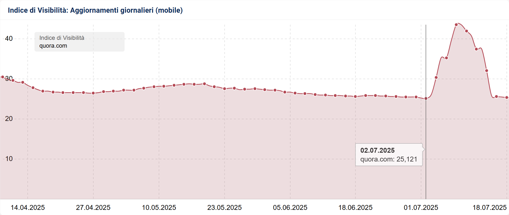 Cominciamo con ordine: l’impatto del June 2025 Core Update è cominciato a partire dal 2 luglio. Da questa data abbiamo infatti cominciato a vedere gli Indici di Visibilità di molti domini cambiare rotta, come negli esempi qui sopra/sotto.