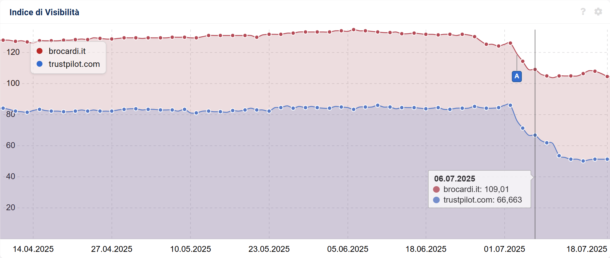 Qui sopra vediamo il confronto di due domini con andamento molto simile: perdita di visibilità il 2 luglio, assestamento, ulteriore perdita il 6 luglio.