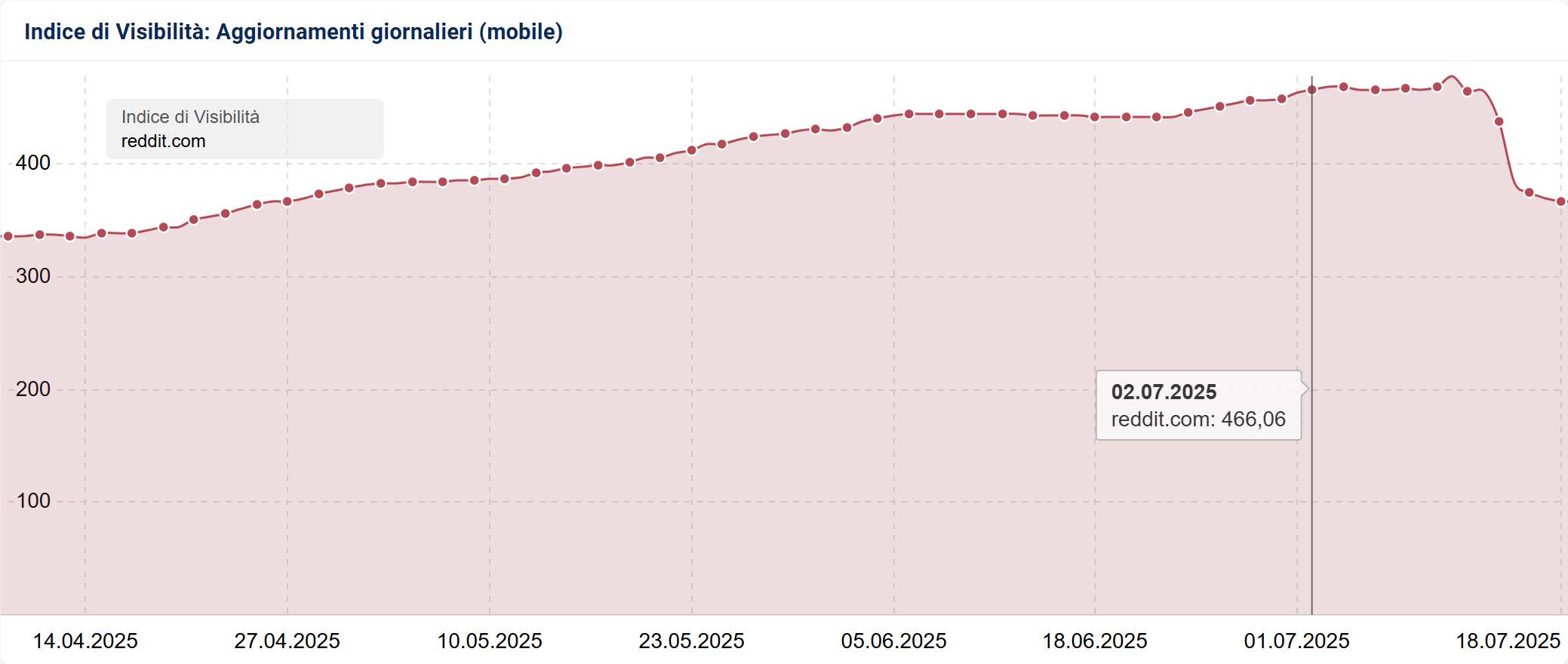 Anche il rivale, Reddit, non se la sta passando però molto bene e perde il 6% della sua visibilità nell’ultima settimana (6 – 14/7). Non sarà colpa del Core Update, ma l’Indice di Visibilità ha cominciato a prendere una brutta piega…