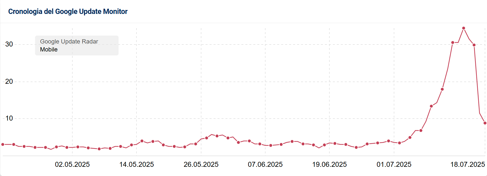 - Google Update Radar: il tool di riferimento per monitorare i movimenti nelle SERP. È gratuito, semplice da utilizzare e aggiornato giornalmente. Dacci un’occhiata!