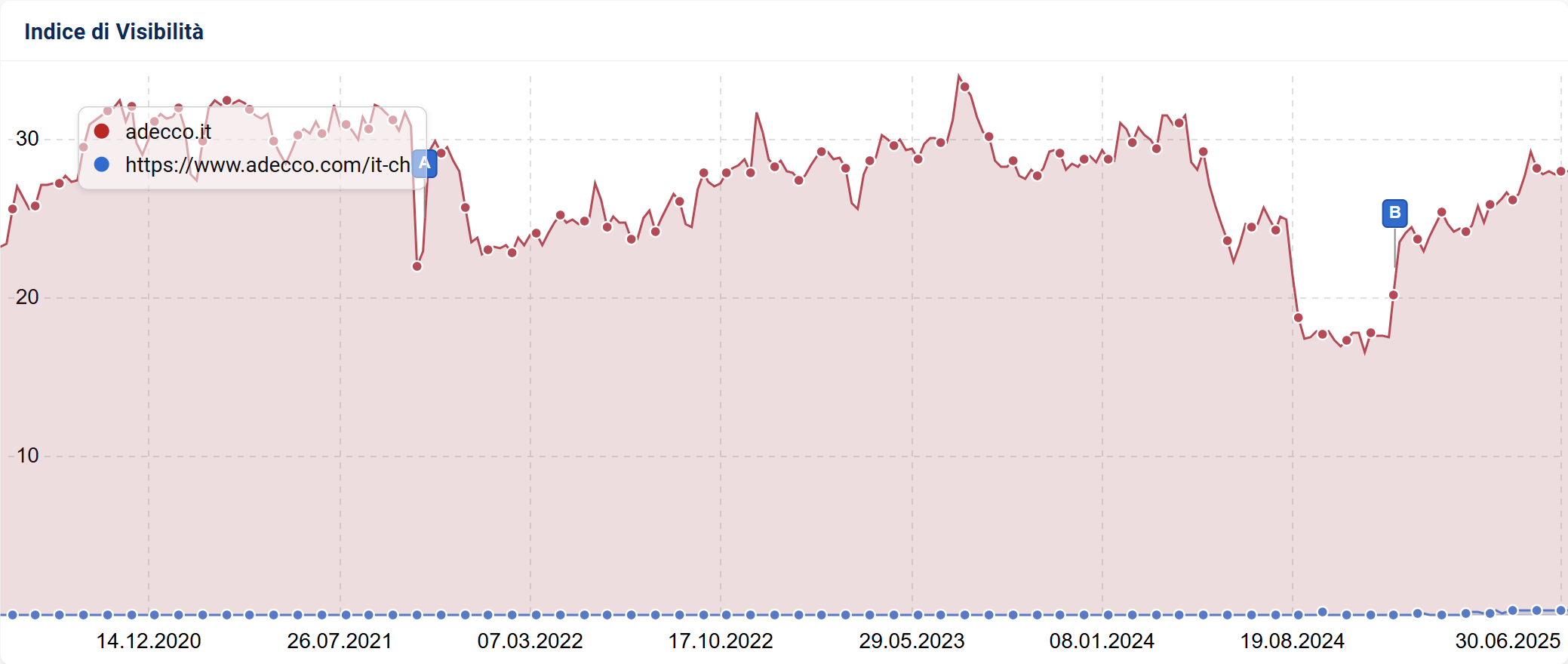Un fenomeno interessante è emerso nel settore delle risorse umane con Adecco. Il dominio https://www.adecco.com/it-ch ha iniziato a competere direttamente nei risultati italiani con il tradizionale adecco.it, creando una situazione di cannibalizzazione che ha paradossalmente portato benefici al dominio globale.