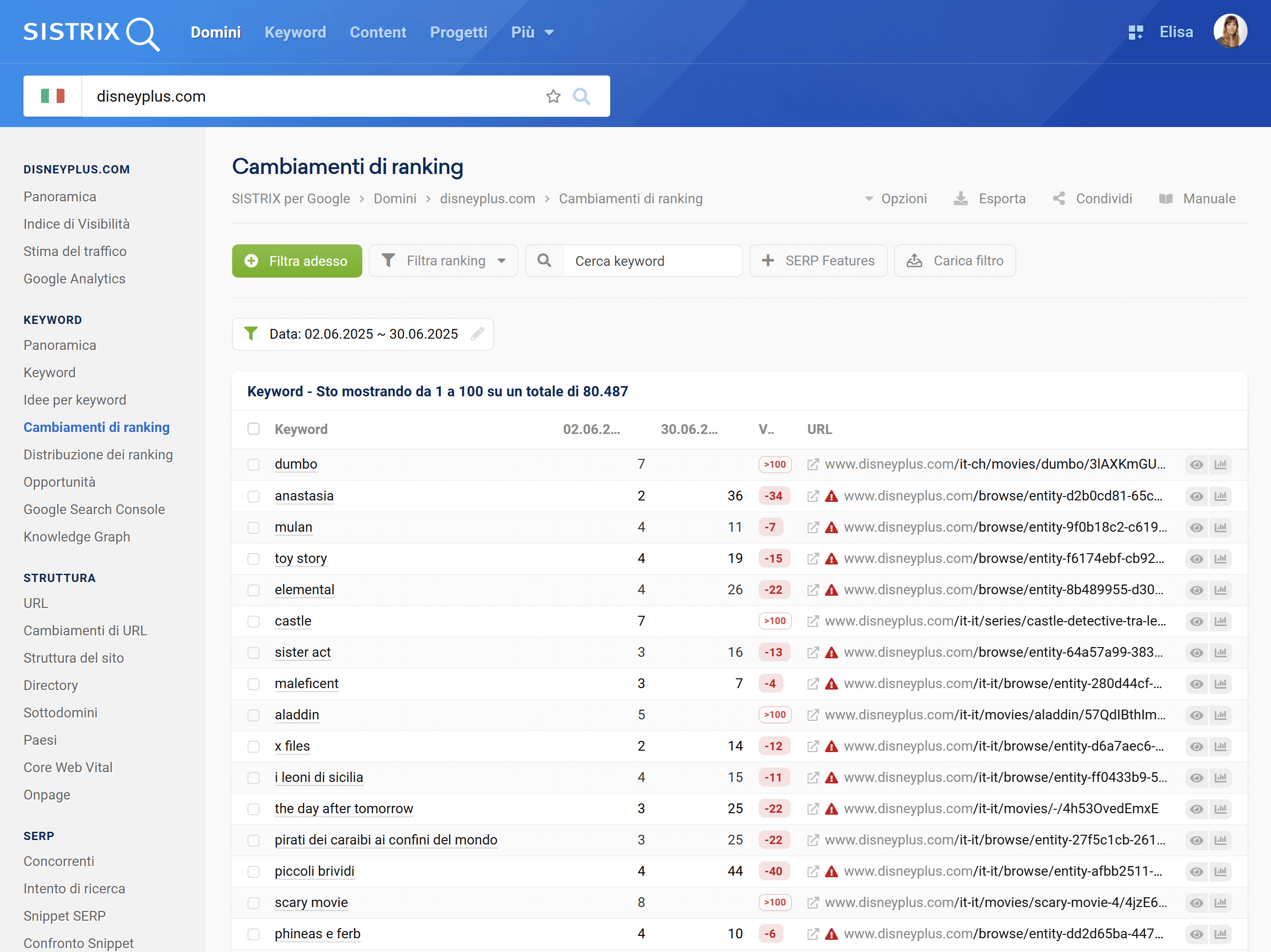 Come mostrano i dati, molte keyword hanno subito perdite drammatiche di posizionamento. Ad esempio: