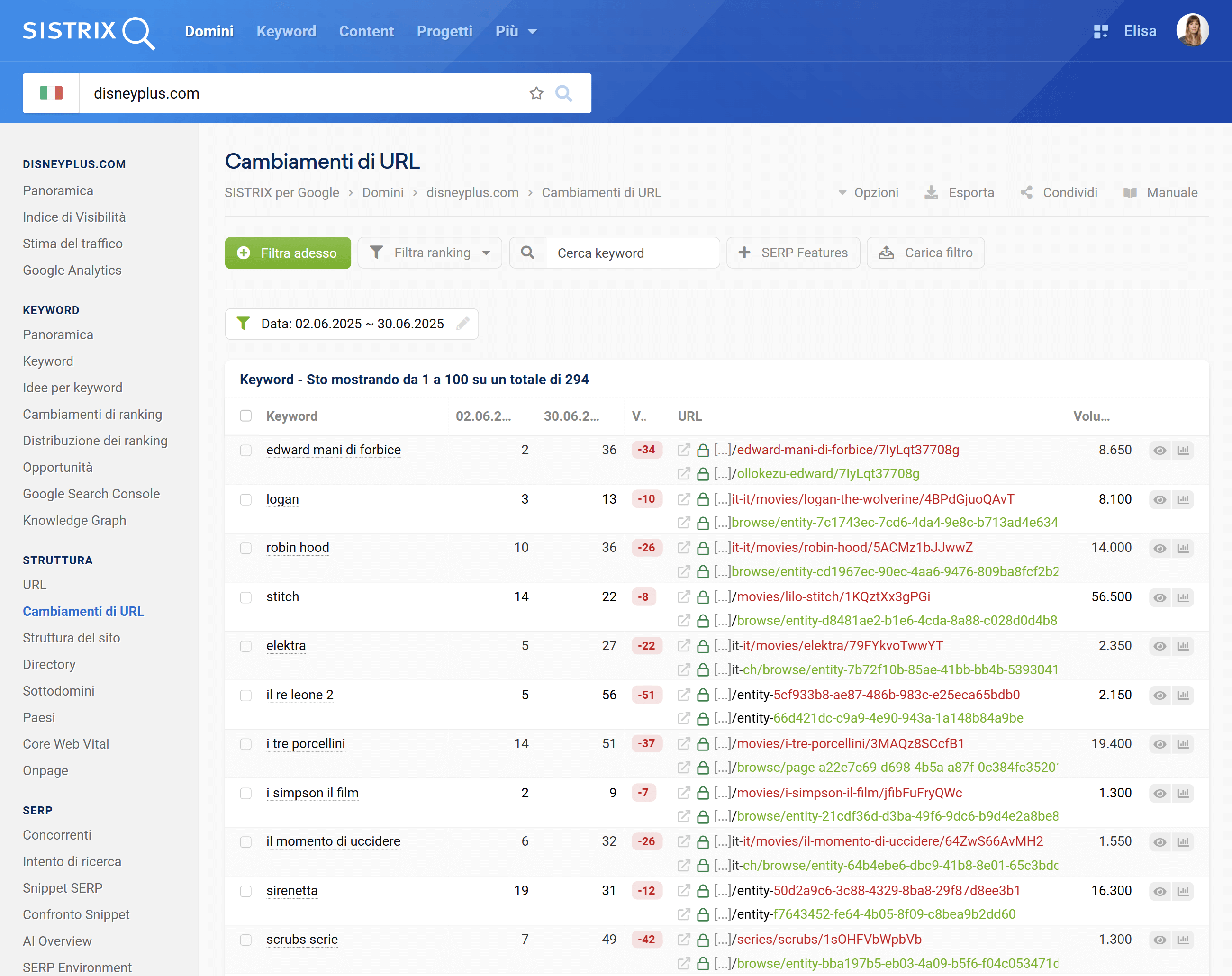 Cambiamenti di URL di disneyplus.com a giugno 2025 su SISTRIX