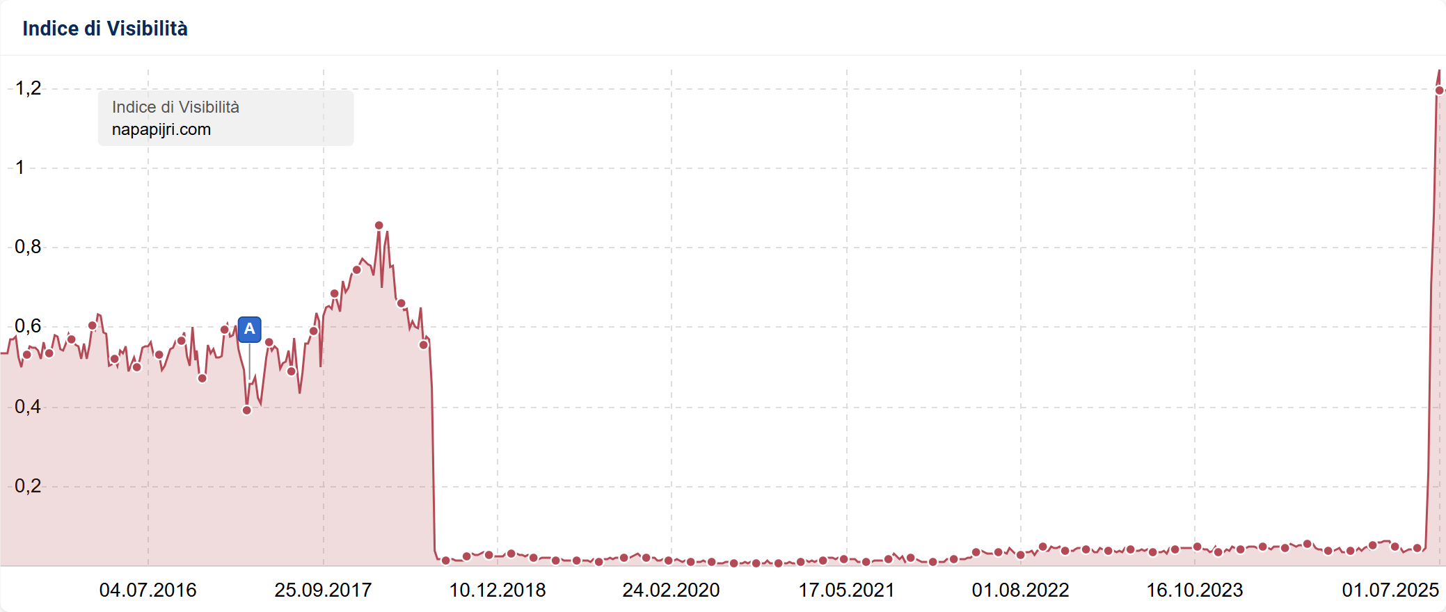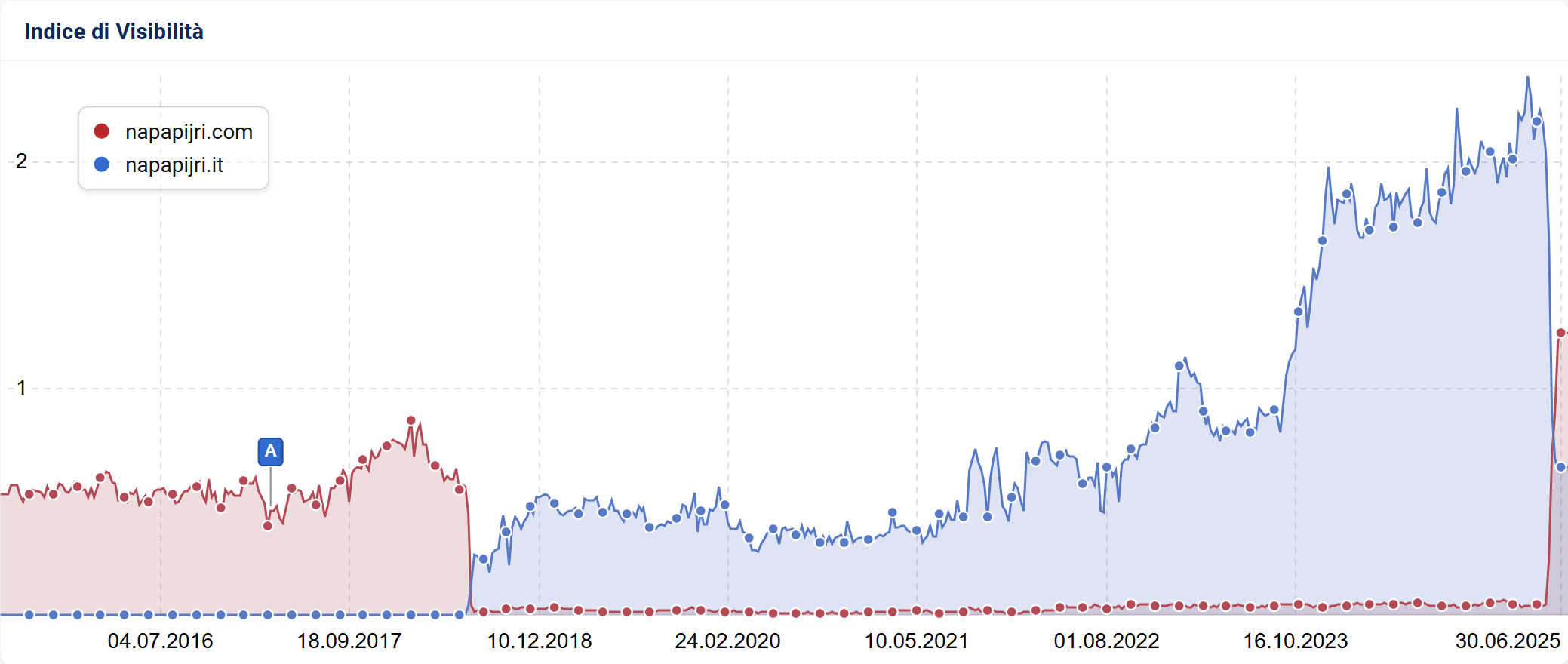Napapijri.com ha registrato una crescita esplosiva nel secondo trimestre 2025, con un incremento di visibilità superiore al 900%. Questo boom non è casuale, ma deriva da una strategia di consolidamento geografico del brand: il dominio ha acquisito tutto il traffico che prima apparteneva a napapijri.it, ora definitivamente dismesso.