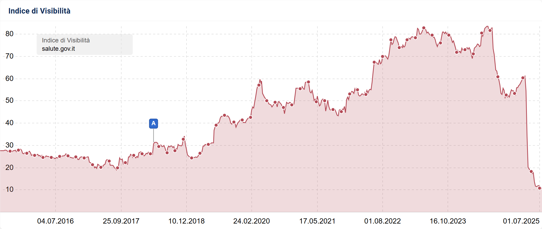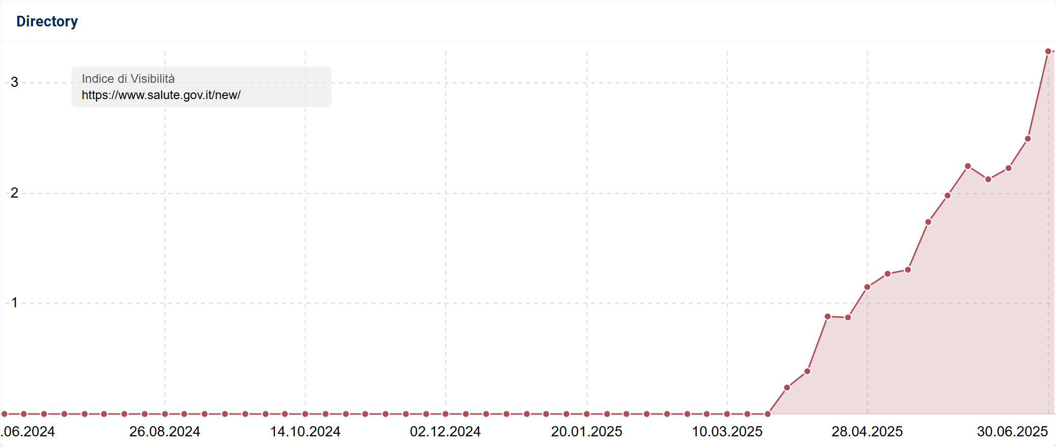 Il caso più clamoroso del trimestre è sicuramente quello di salute.gov.it, che ha subito un crollo di visibilità del 79%. Il sito del Ministero della Salute è stato oggetto di una migrazione selvaggia verso la cartella /new/ senza seguire alcuna linea guida SEO ragionevole.