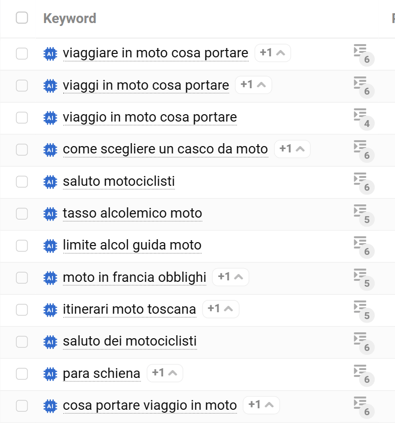 Query molto specifiche come ”come funziona l’airbag per la moto” o molto generiche come “caschi jet migliori” sono comunque state inserite nell’analisi.