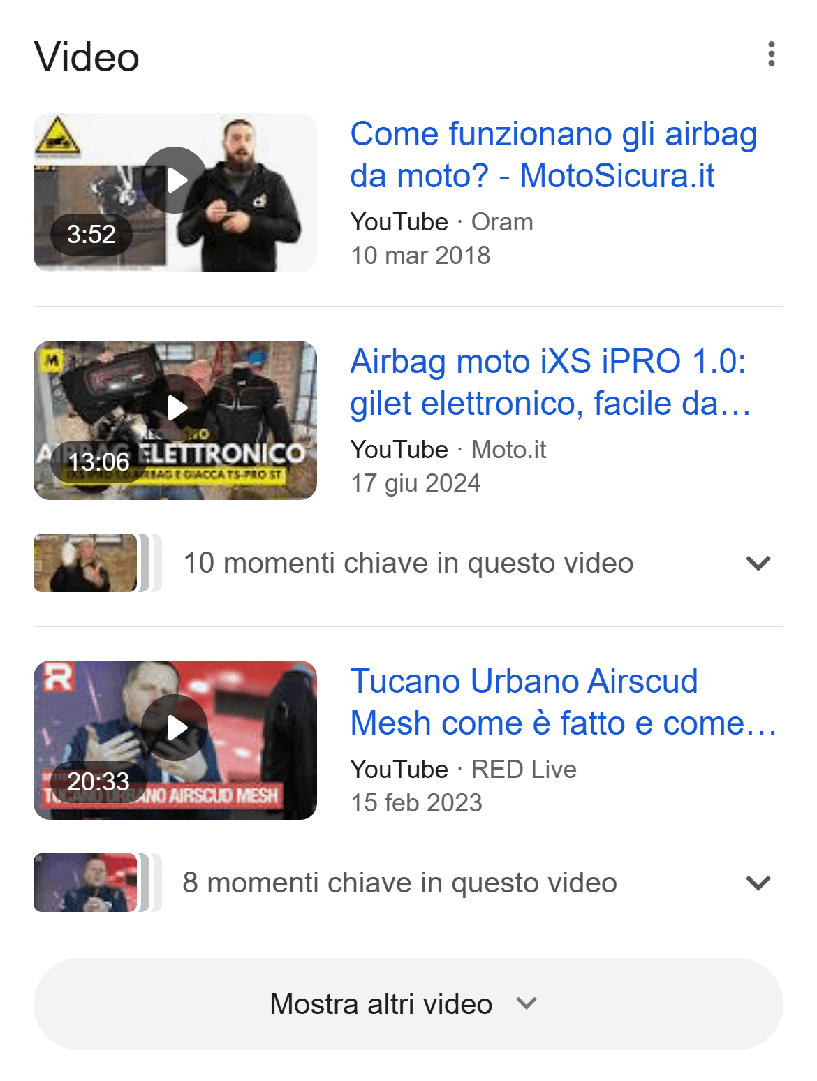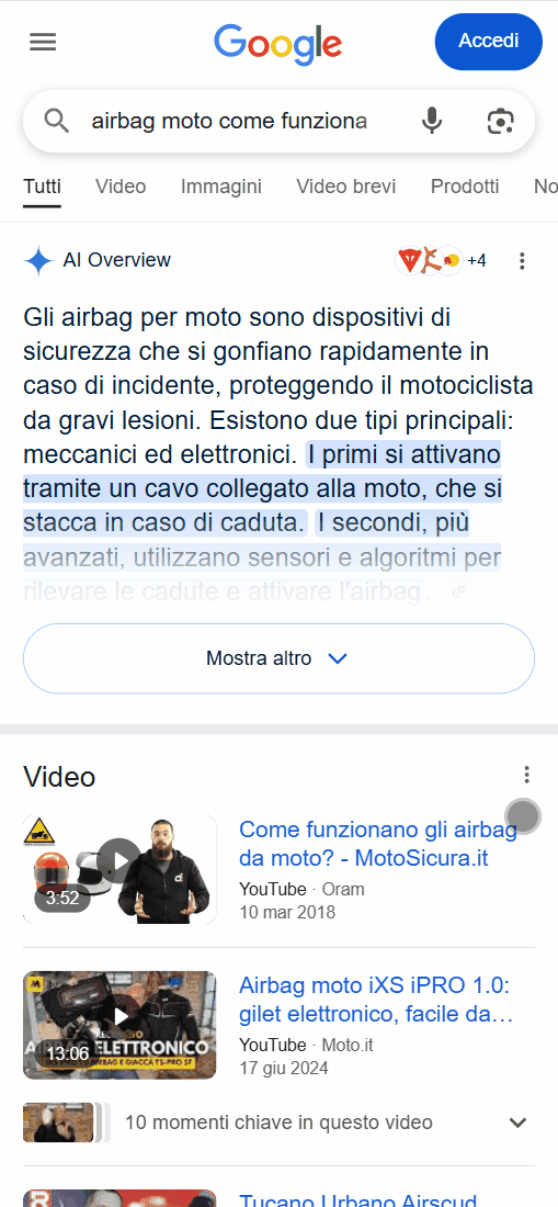 Non basta più conquistare il classico “link blu”: per alcuni intenti informazionali, come confrontare due caschi da moto o dimostrare il funzionamento di un airbag protettivo, il video su YouTube o il reel su Instagram sono oggi i formati più efficaci per intercettare e convincere l’utente.