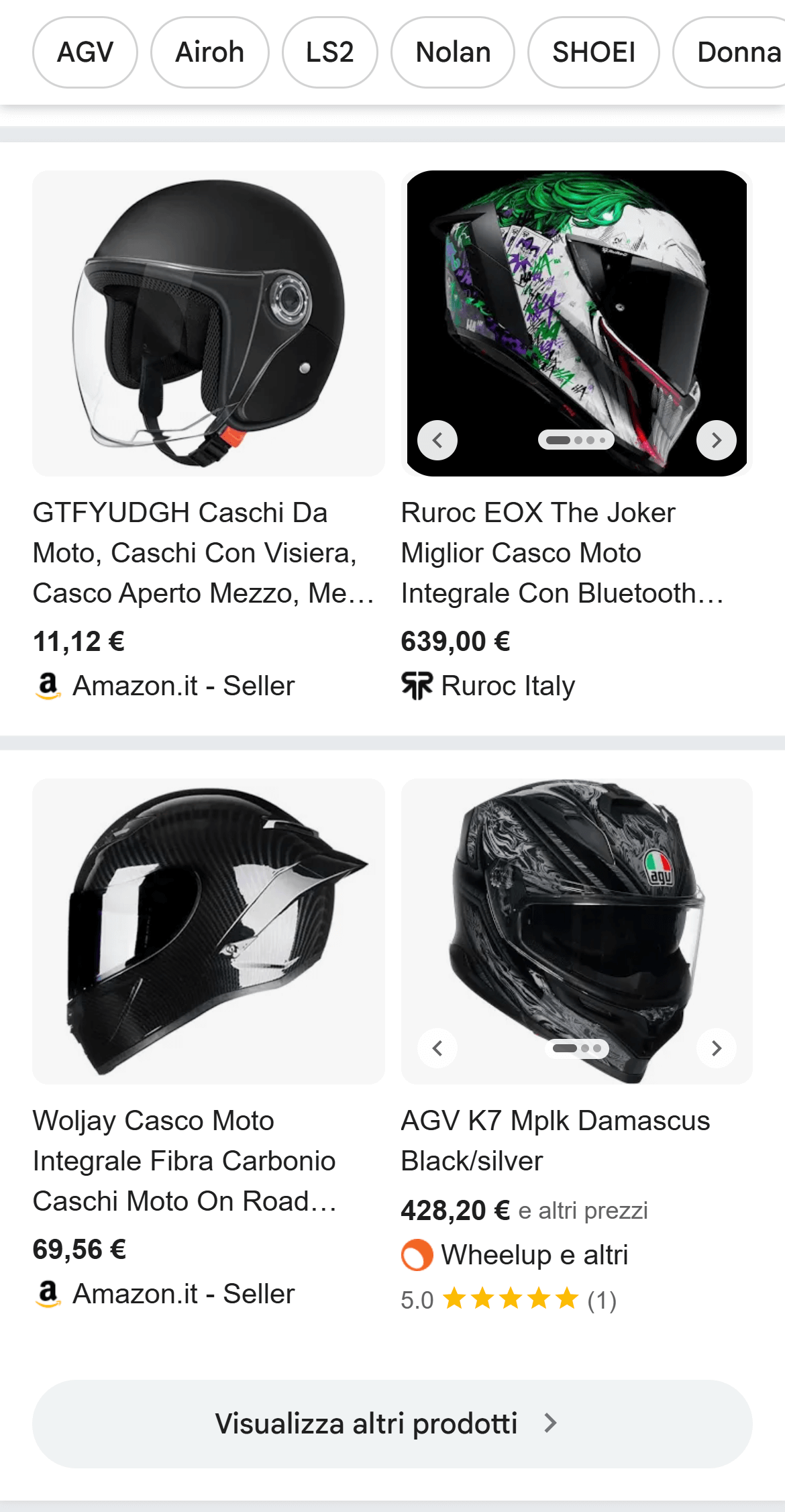 - Le categorie prodotto generiche (es. caschi moto, giacche moto) sono il vero terreno di battaglia per la SEO transazionale: i volumi sono alti, ma vince solo chi sa offrire una buona esperienza di navigazione con cataloghi filtrabili e informazione chiara.
