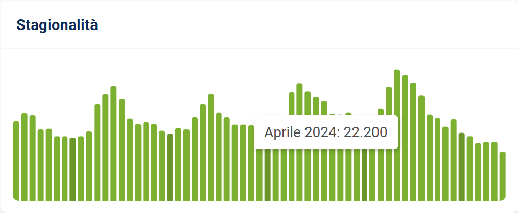 Gli aumenti significativi di volume di ricerca si concentrano tipicamente fra marzo e giugno (prima dell’estate, iniziano le prime gite fuori porta) e da ottobre a novembre (preparazione alla stagione invernale), segnale che sono i periodi in cui la competizione in SERP è massima.