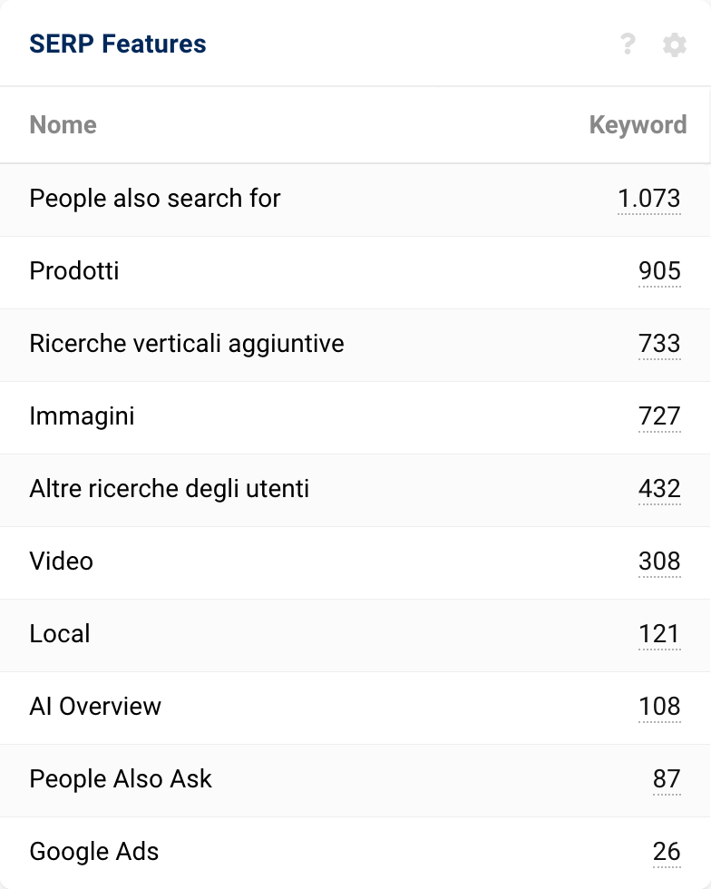 - Visual, feed prodotti e dati strutturati determinano la presenza nelle SERP feature più presenti in questo settore.