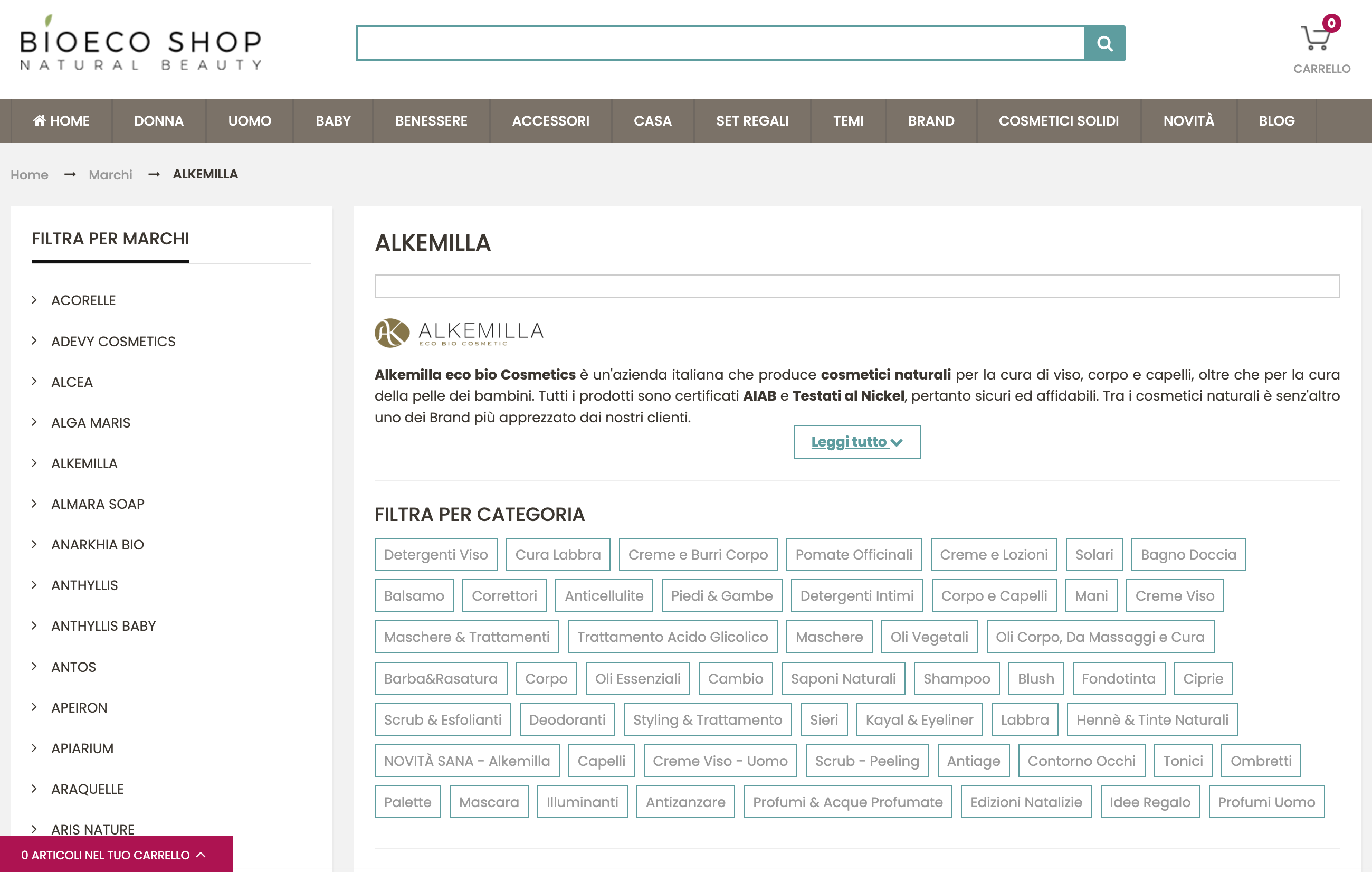 Oltre alle canoniche pagine brand, il sito presenta un numero molto elevato di pagine brand + categoria (es. “La Saponaria crema mani”, “Organic Shop shampoo”, ecc.).