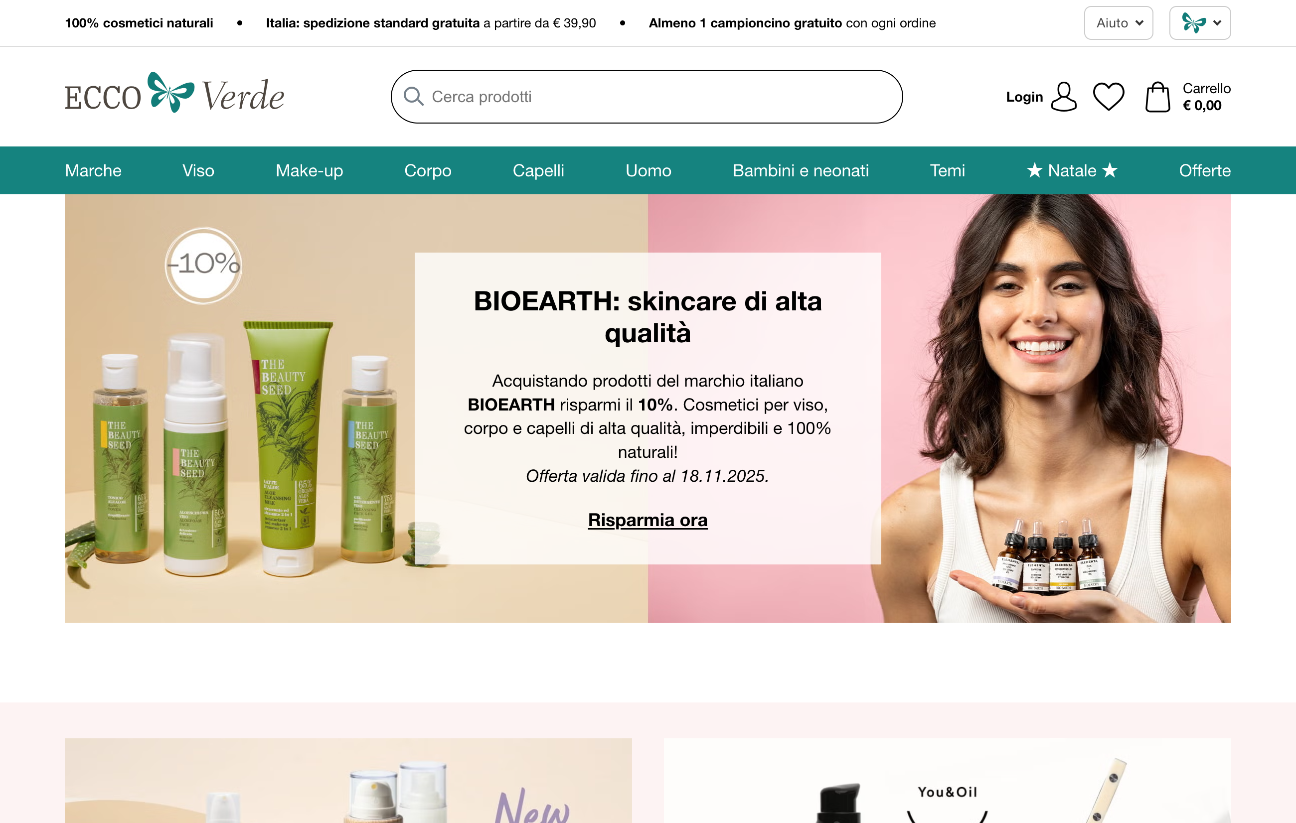 In seconda posizione troviamo EccoVerde.it, un e-commerce multimarca specializzato in cosmesi naturale. Ogni pagina ribadisce in modo netto il posizionamento del brand attraverso il claim “100% cosmetici naturali”, presente nell’header, che rimanda a una sezione dedicata ai criteri di selezione e ai valori aziendali.