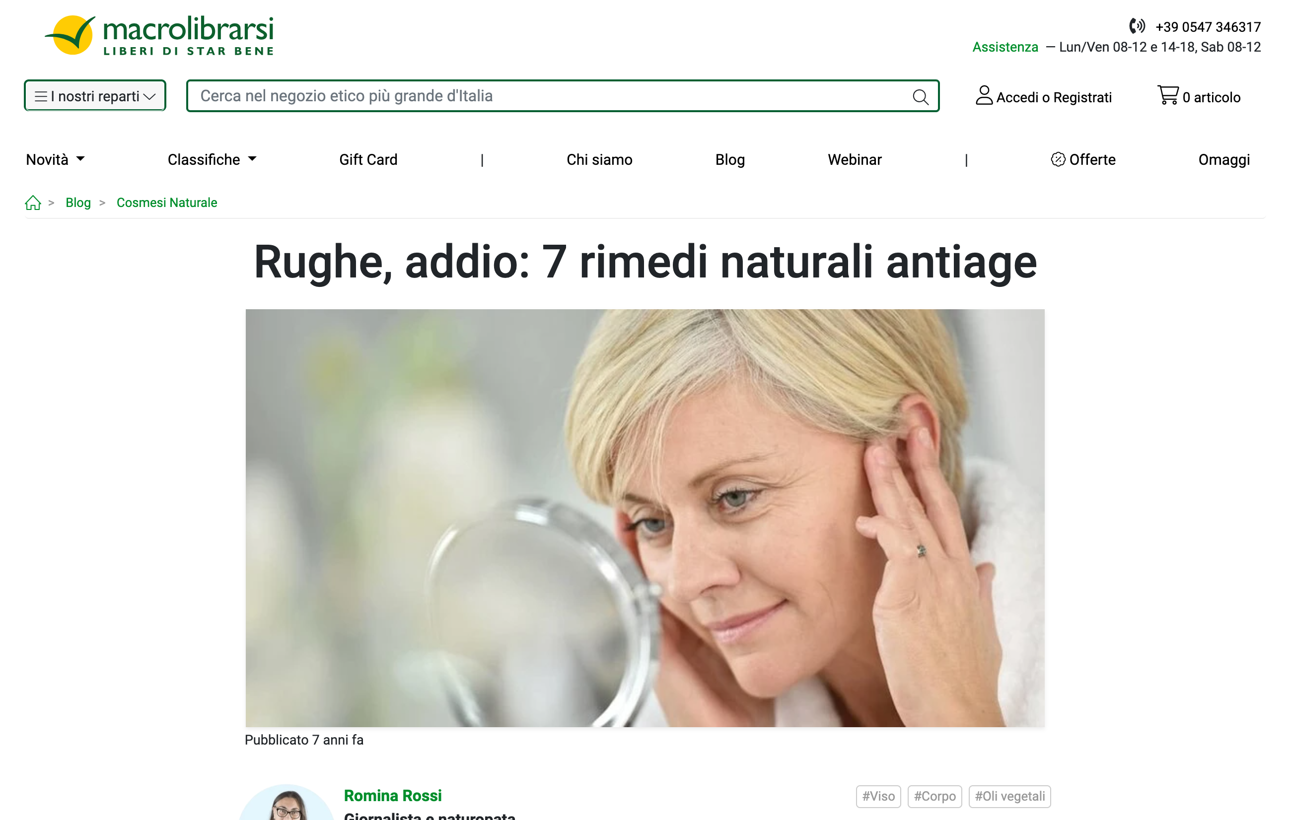 Il post “Rughe, addio: 7 rimedi naturali antiage” ne è una dimostrazione: l’articolo risolve un problema specifico dell’utente e integra in modo fluido i prodotti correlati disponibili nell’e-commerce come possibili risposte al bisogno espresso.
