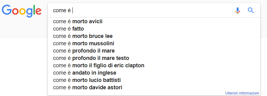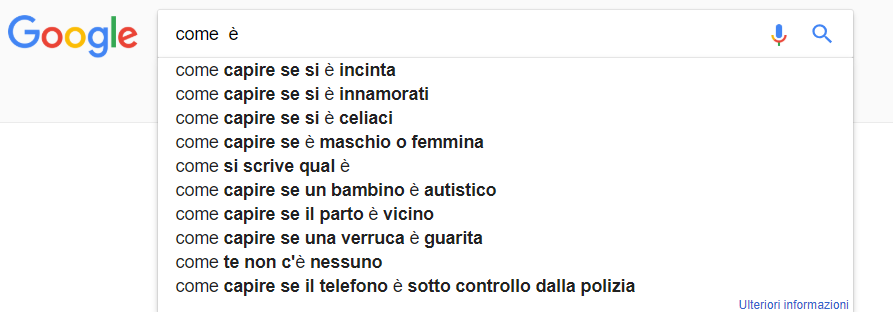 Una modalità interessante per usare Google Suggest è quella di digitare “come è”, e poi premere nuovamente la barra spaziatrice per aggiungere uno spazio nella posizione desiderata. Google Suggest, a questo punto, riempirà lo spazio con delle parole che sono spesso oggetto di ricerca per tale query.