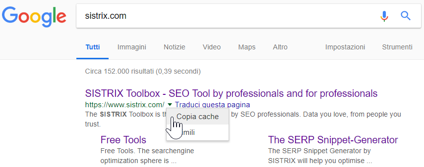 ✓: site:sistrix.it – Google riconosce che sistrix.it appartiene all’operatore di ricerca site: