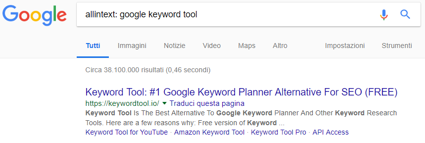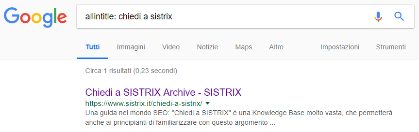 Anche per intitle esiste la versione allintitle:, che limita la ricerca a quei risultati che possiedono determinate parole all’interno del Title Tag della pagina.