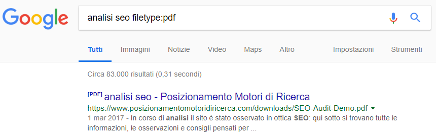 Con questo operatore potrai indicare l’estensione del file dei tuoi risultati di ricerca. Se, ad esempio, ti capita di voler sapere se Google sta indicizzando dei pdf della tua pagina, ricordare questo operatore ti tornerà utile.