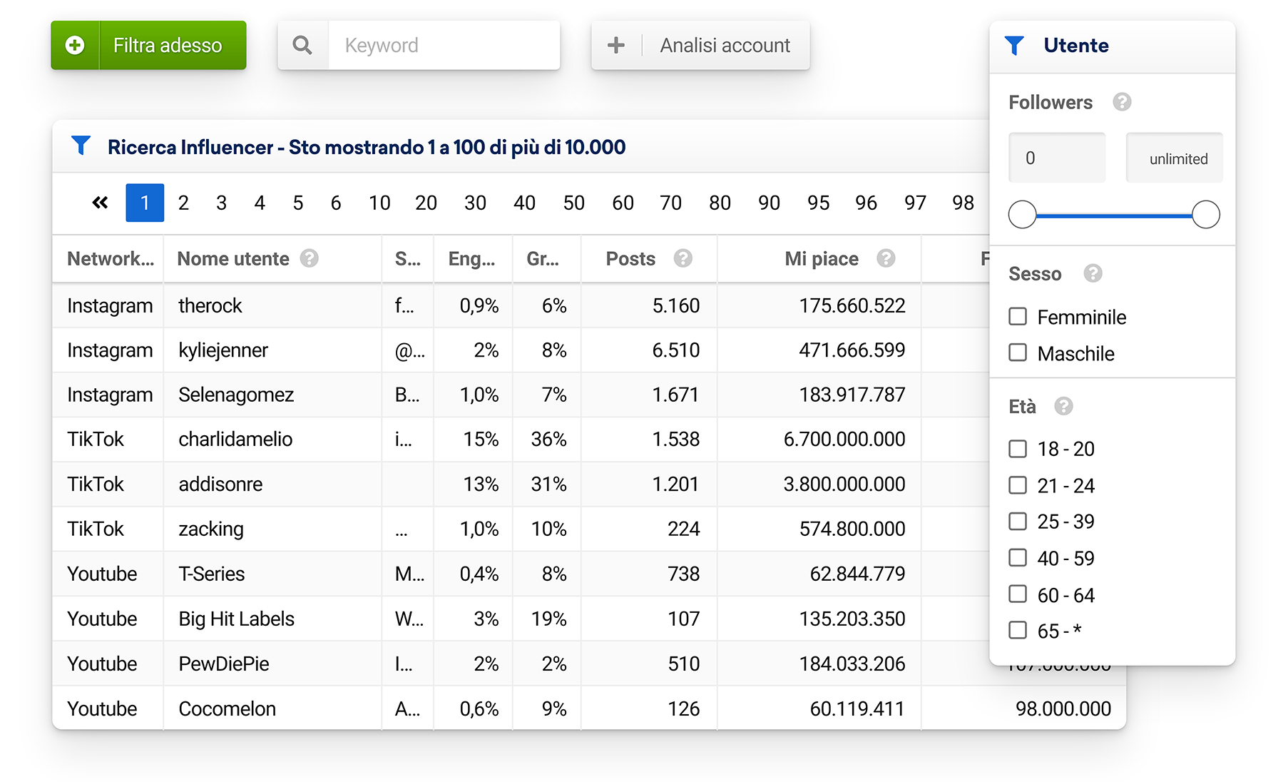 Analizza più di 94 milioni di profili sulle piattaforme di Content Creators più importanti e trova i giusti influencer su Tiktok, Instagram e Youtube.