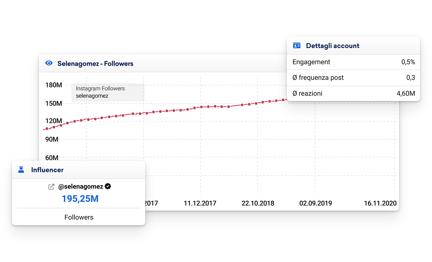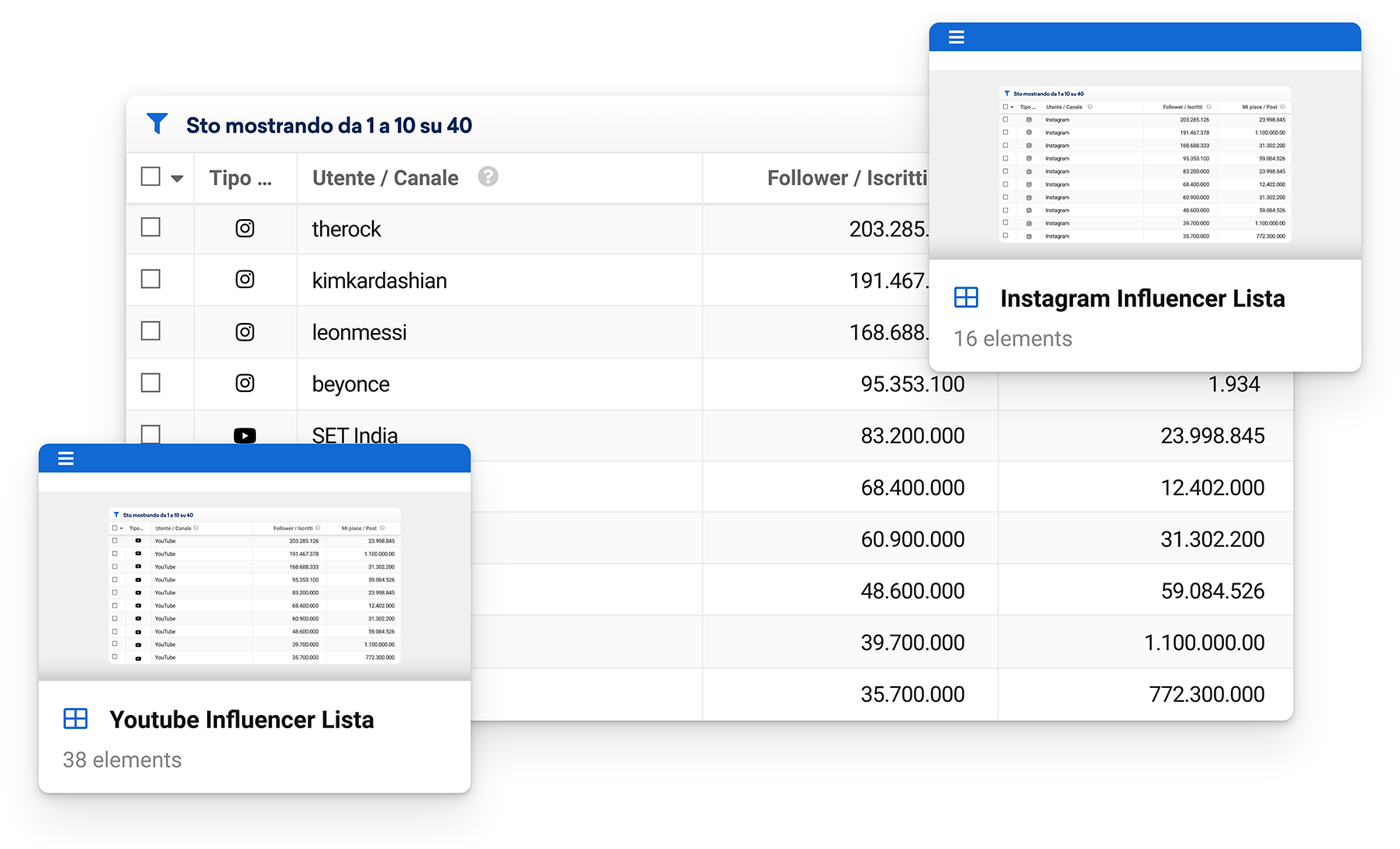 Trova i Content Creator più rilevanti nel giro di pochi secondi. Filtra più di 94 milioni d’influencer dei network maggiori e individua i profili adatti a te.