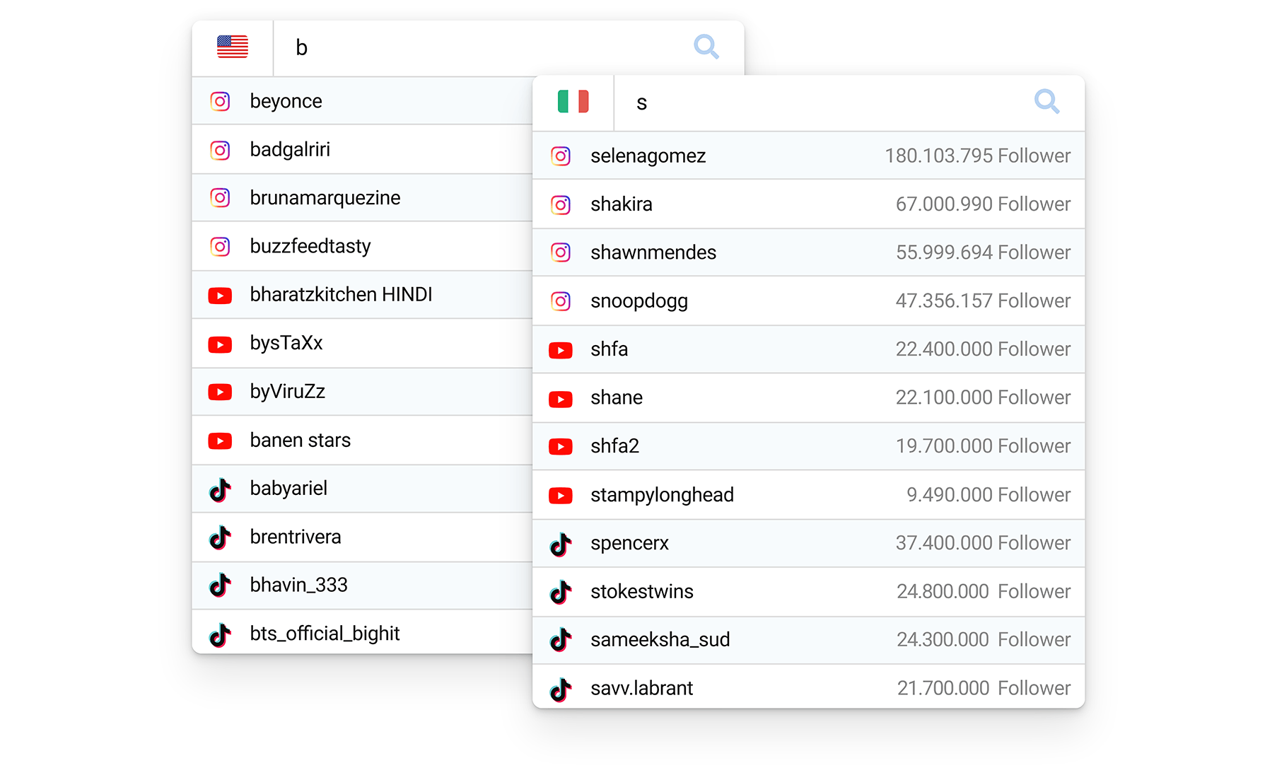 L’audience influisce sul formato delle piattaforme. Grazie a SISTRIX potrai ricercare i profili degli influencer su tutte le piattaforme più rilevanti per i creatori di contenuti: Instagram, Tiktok e Youtube.