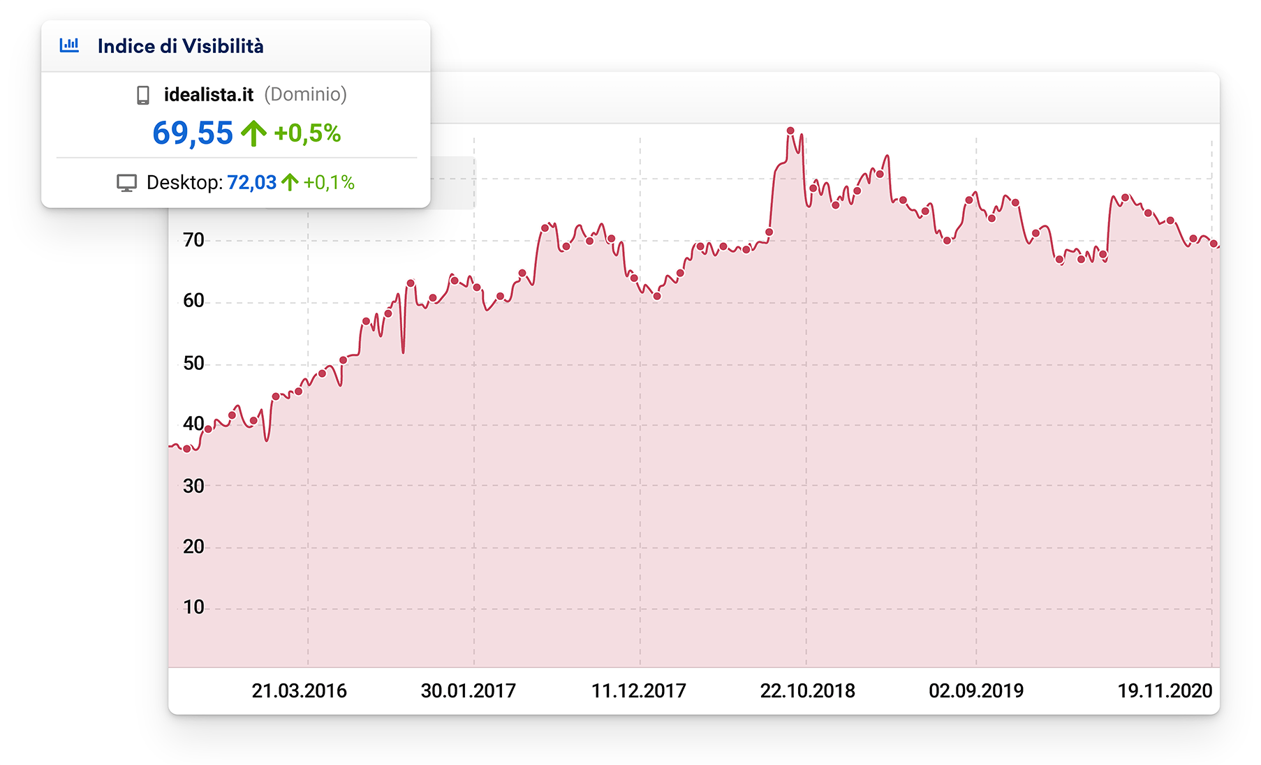 Dal 2008 l’Indice di Visibilità di SISTRIX è la metrica per misurare il successo nella SEO. Ogni giorno analizziamo milioni di risultati di ricerca di Google, rendendoli disponibili nella banca dati maggiore d’Europa.