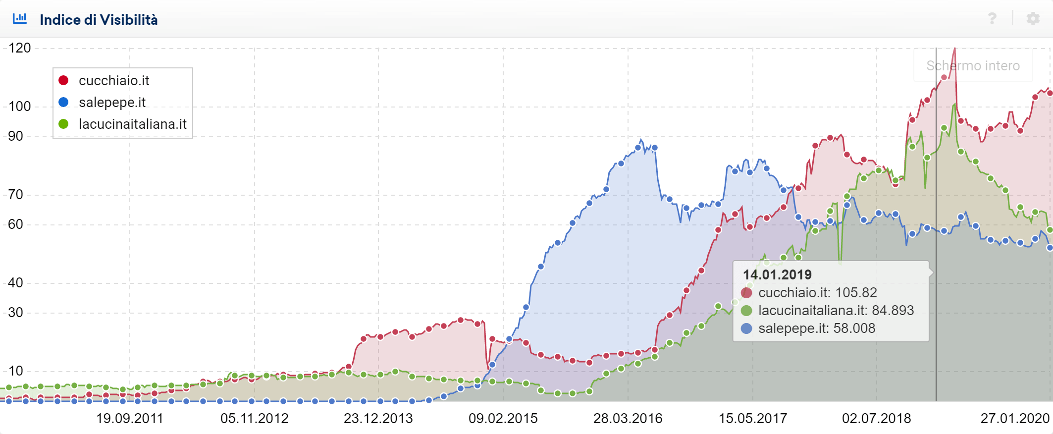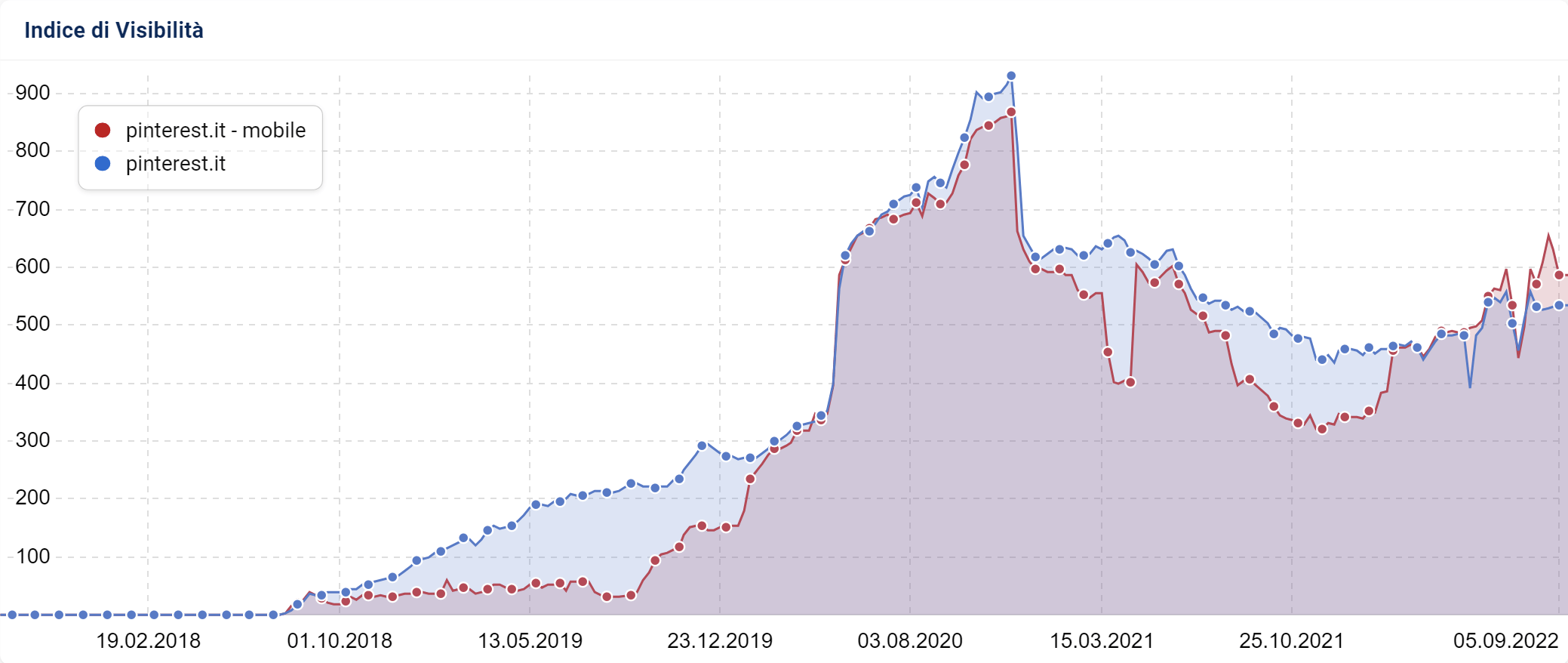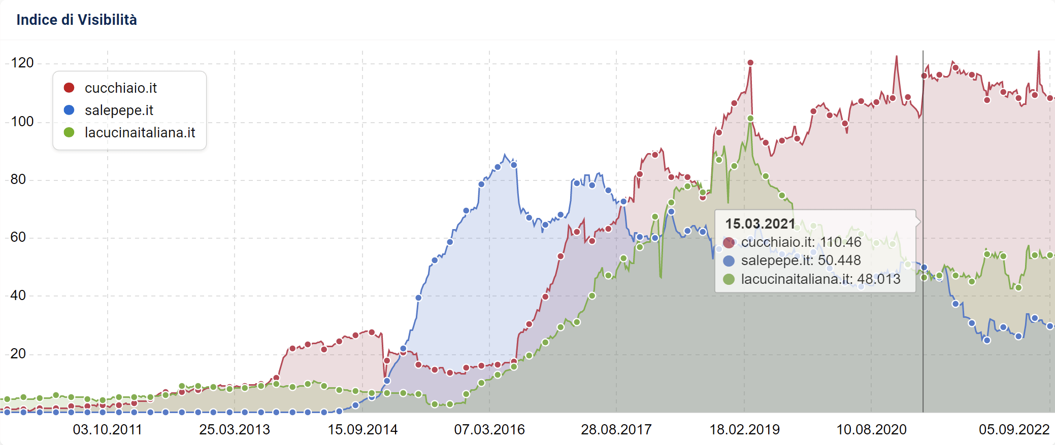 In qualità di creatori dell’Indice di Visibilità, offriamo questa metrica da circa 15 anni, permettendoti di analizzare retrospettivamente qualsiasi dominio, ma anche sottodominio, directory o persino singolo URL nel tempo.