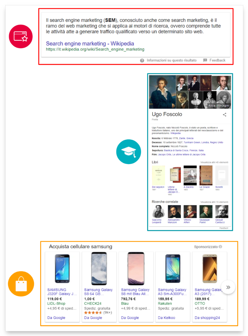 Oltre agli elementi descritti in precedenza esistono tanti altri risultati delle SERP, relativi alle singole richieste di ricerca. Di seguito ne abbiamo riportati alcuni: