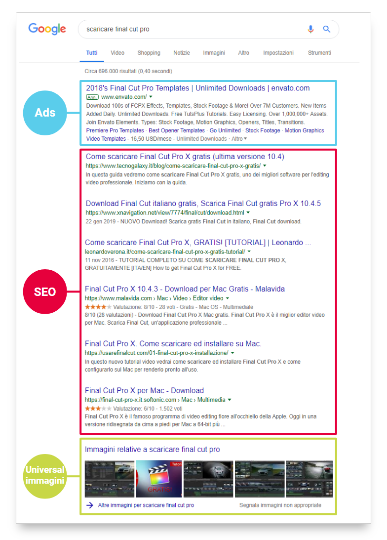 In mezzo ai risultati a pagamento (Google Ads) troverai i risultati organici. Normalmente una pagina dei risultati di ricerca di Google riporta dieci risultati organici. Questi rientrano nella categoria SEO.