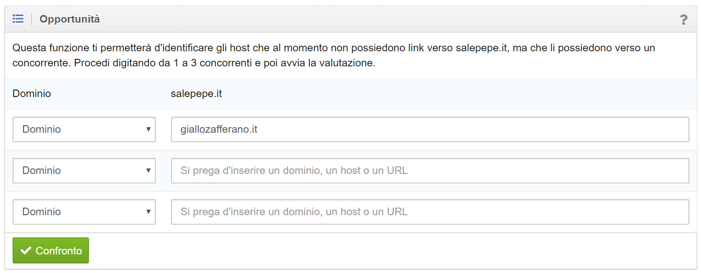Cliccando su “Aggiungi” potrai confrontare il tuo dominio con fino a tre concorrenti. Nel nostro esempio abbiamo deciso di confrontare dei siti di consulenza legale online. Ricorda che se inserisci più di un concorrente, ti mostreremo solo i link in comune tra tutti i domini inseriti.