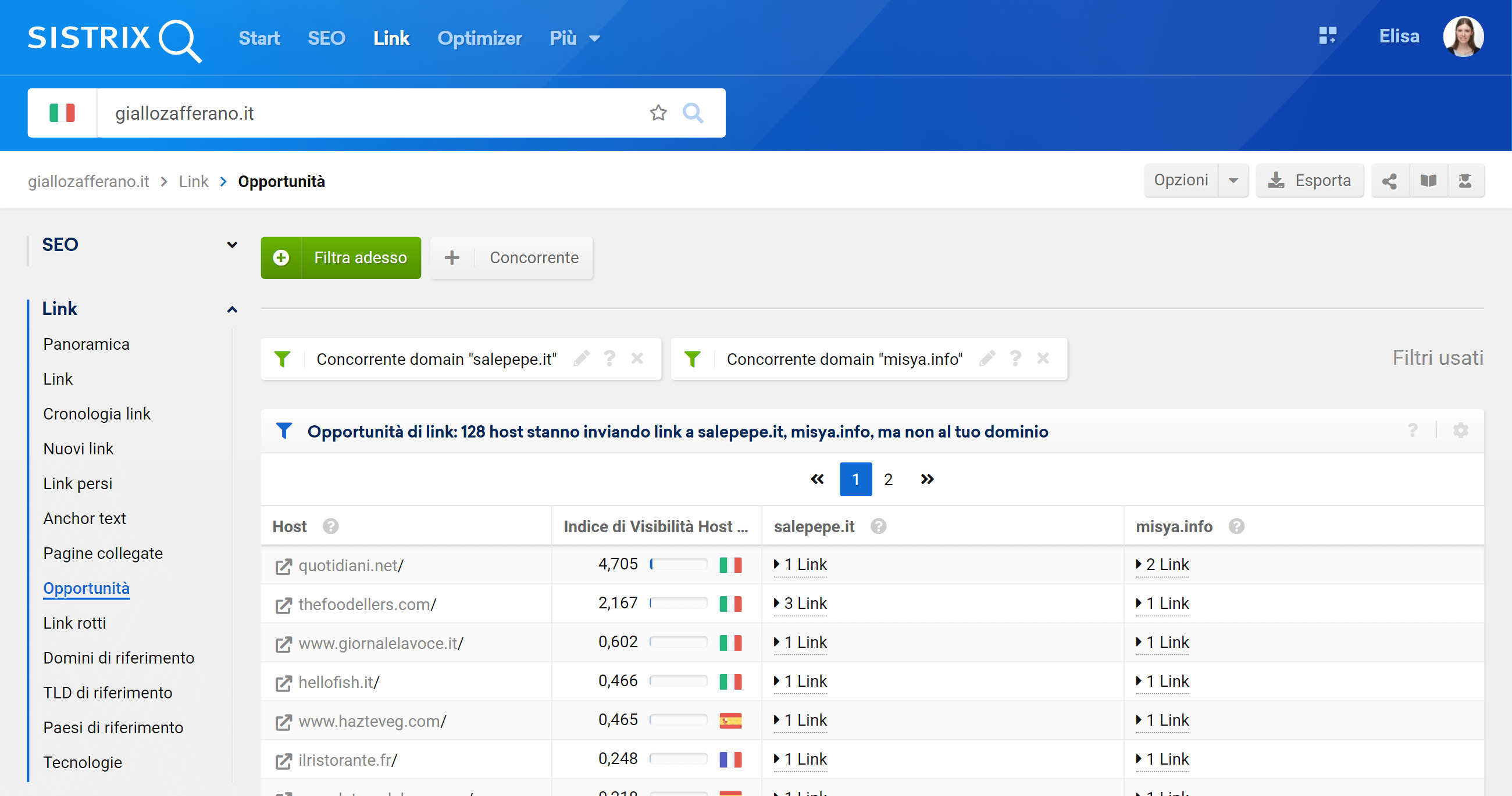 Nella panoramica dei risultati vediamo ad esempio che un totale di 76 host inviano link sia a consulenzalegaleitalia.it che a altalex.com con almeno un link ciascuno, ma non a laleggepertutti.it.