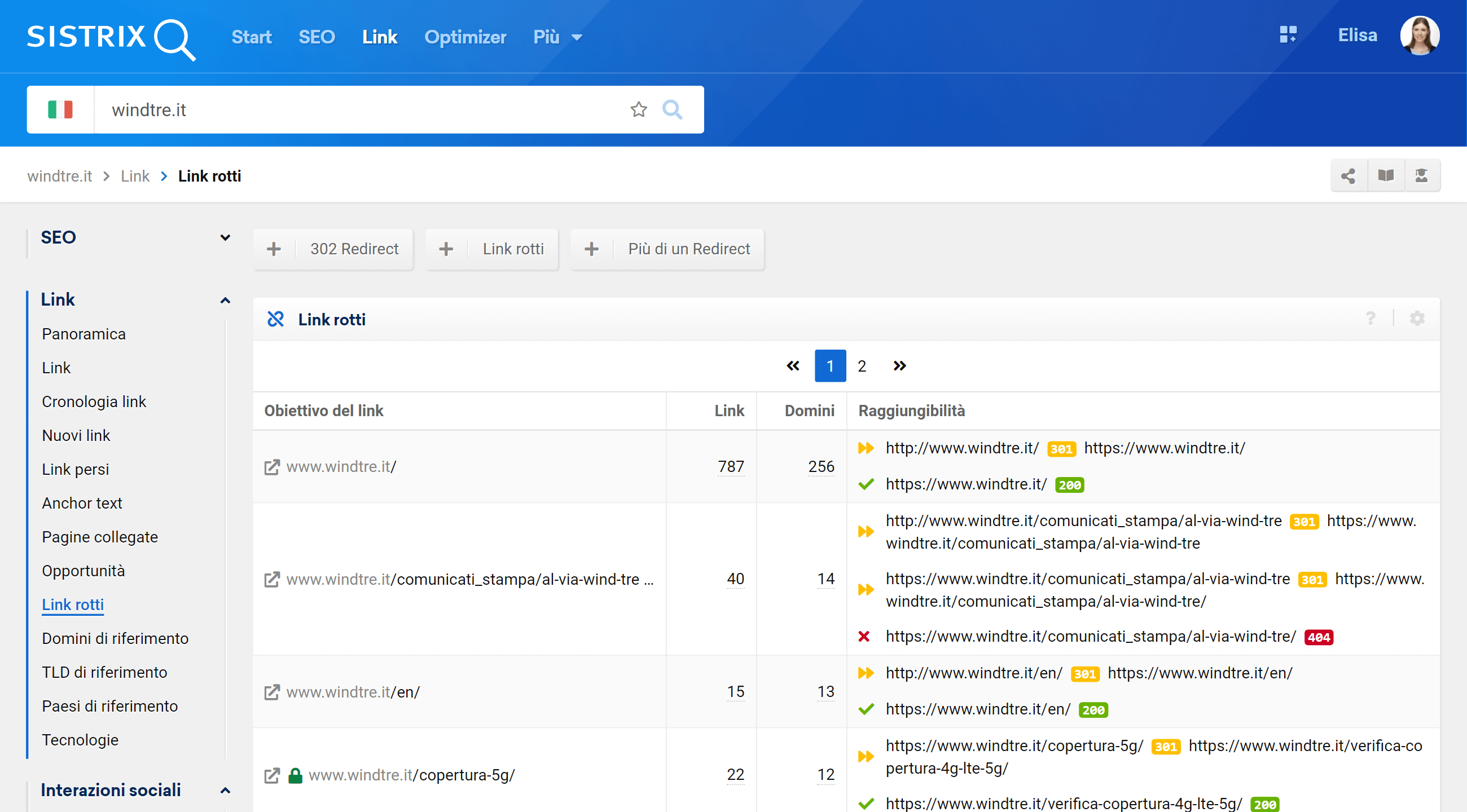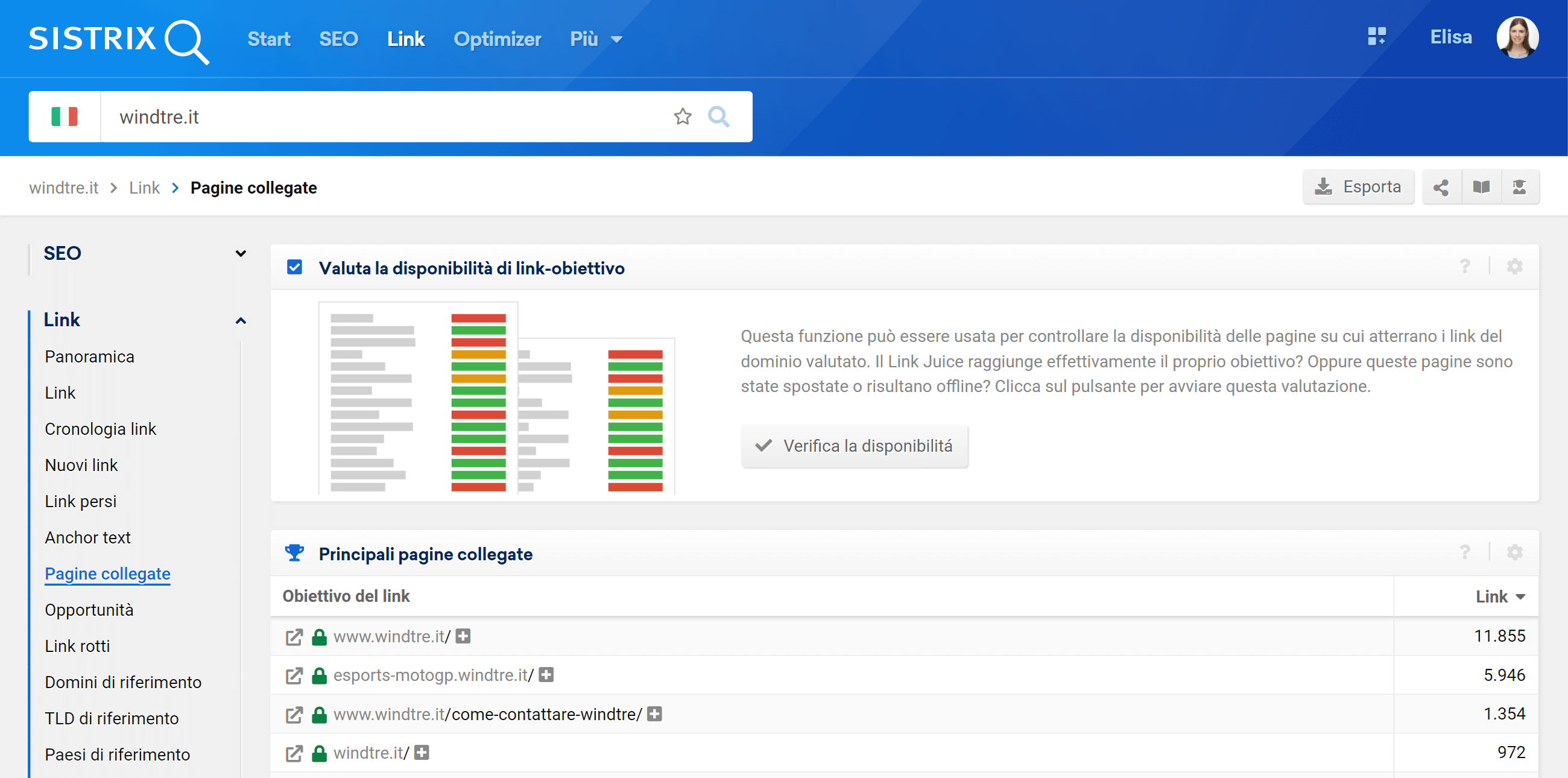 Digita il tuo dominio all’interno della barra di ricerca di SISTRIX 1: in questo tutorial userò il dominio windtre.it, sito che è stato recentemente oggetto di migrazione. Dopo aver digitato il nome del dominio, clicca sulla voce “Pagine collegate” nel modulo Link, posta nel menù laterale a sinistra dello schermo 2. La schermata che comparirà sarà la seguente: