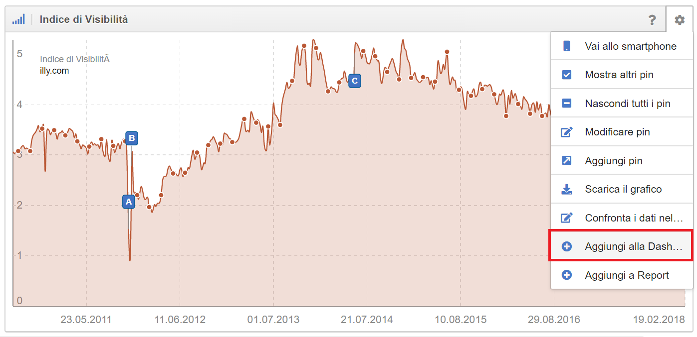 Comincia digitando il dominio che t’interessa nella barra di ricerca di SISTRIX: ti troverai nella sua pagina di panoramica. Ora rivolgiti ad uno dei box (in questo caso a noi interessa il grafico dell’Indice di Visibilità), e clicca sull’icona dell’ingranaggio. Si aprirà un menù in cui potrai selezionare “Aggiungi a Dashboard”: la tua prima Dashboard è stata creata, e la troverai nella sezione dedicata.