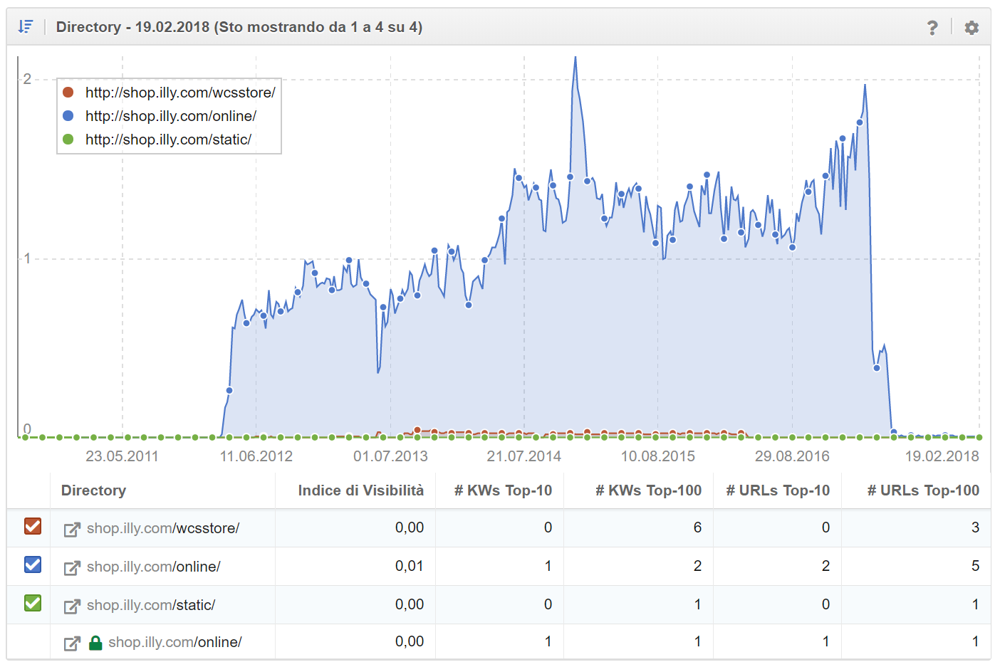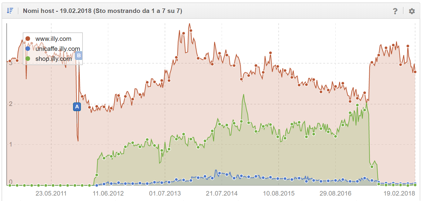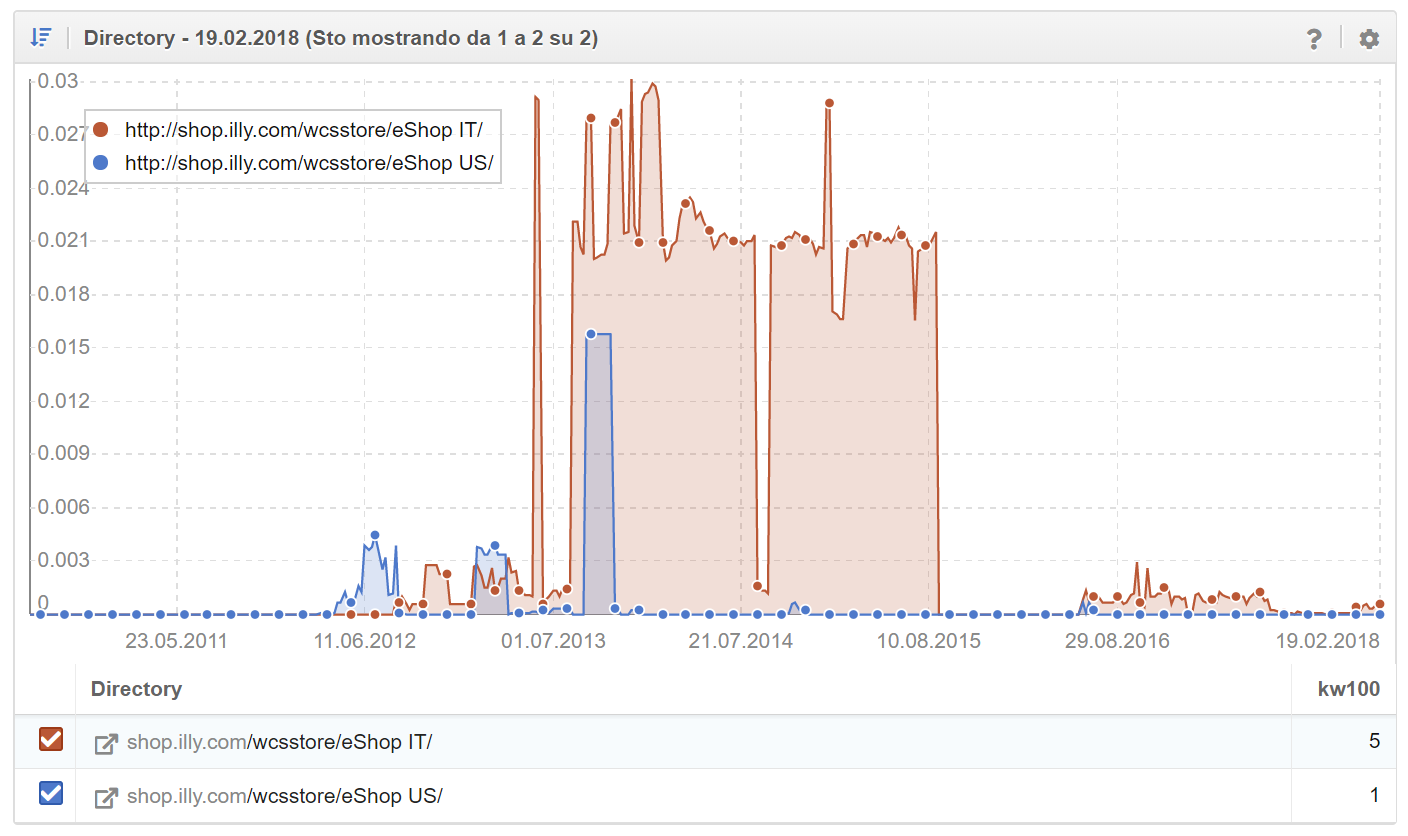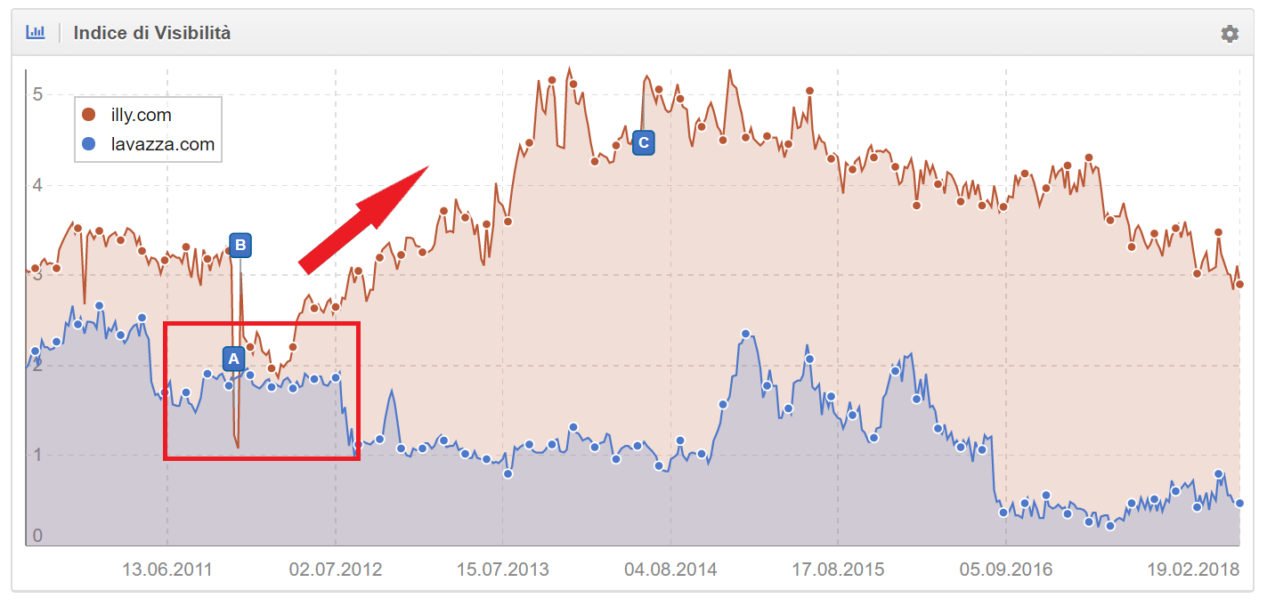 Illy.com era inizialmente più visibile del suo concorrente lavazza.it. Nel 2015, però, la visibilità dei due domini è arrivata allo stesso livello, e Illy non ha saputo reagire. Mentre Lavazza ha attuato una strategia SEO di successo, guadagnando sempre più posizionamenti, Illy ha imboccato un trend in discesa.