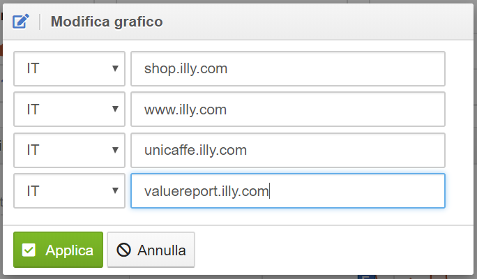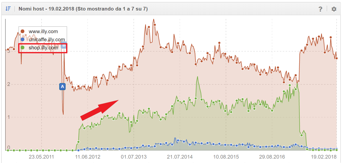 Nel caso uno dei sottodomini che t’interessa analizzare non fosse mostrato nel grafico, puoi cliccare sulla voce “Confronta grafico”, a cui puoi accedere sempre dall’icona dell’ingranaggio posta in alto a destra del grafico. Si aprirà un campo testuale a destra dello schermo dove potrai modificare i domini confrontati.