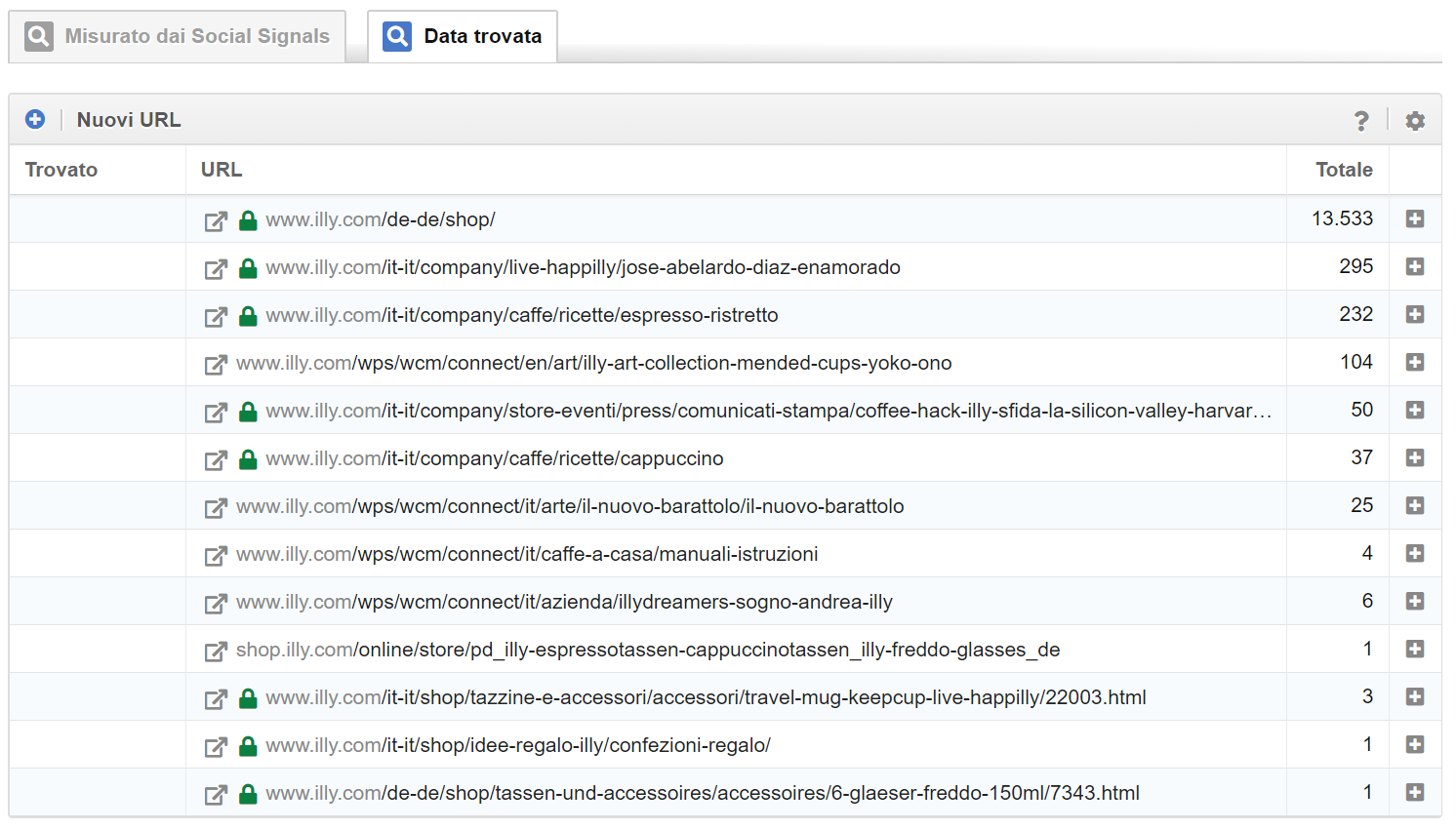 Per scoprire i nuovi URL di un concorrente, quello che devi fare è semplicemente valutare il dominio su SISTRIX. Digita il dominio nella barra di ricerca e clicca sulla voce “Nuovi URL” nel modulo Social: comparirà una tabella contenente gli ultimi URL che sono stati correntemente condivisi sui social media.