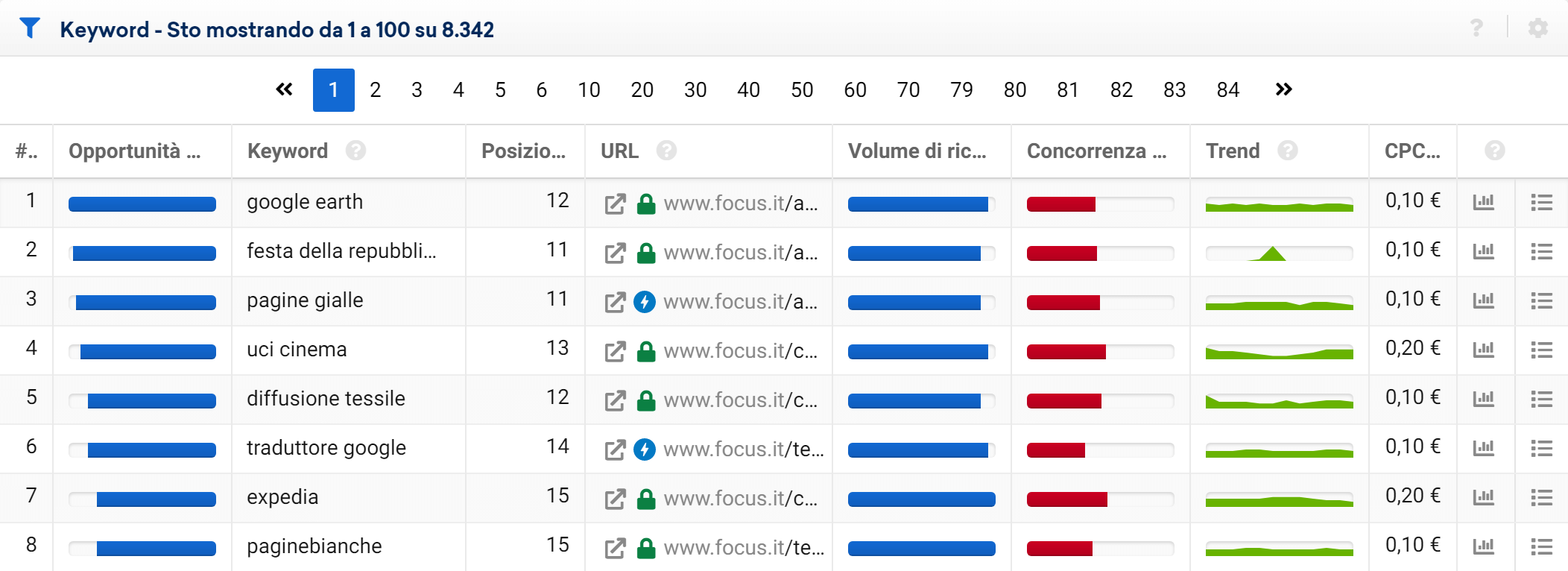 La tabella delle opportunità contiene tutte le keyword per le quali il dominio inserito non si posiziona nella prima pagina delle SERP, ma che potrebbe raggiungerla se ottimizzato. Grazie a questa semplice lista potrai velocemente capire a quali contenuti dare la priorità, siccome il 99% dei click avviene proprio nella prima pagina dei risultati di Google.