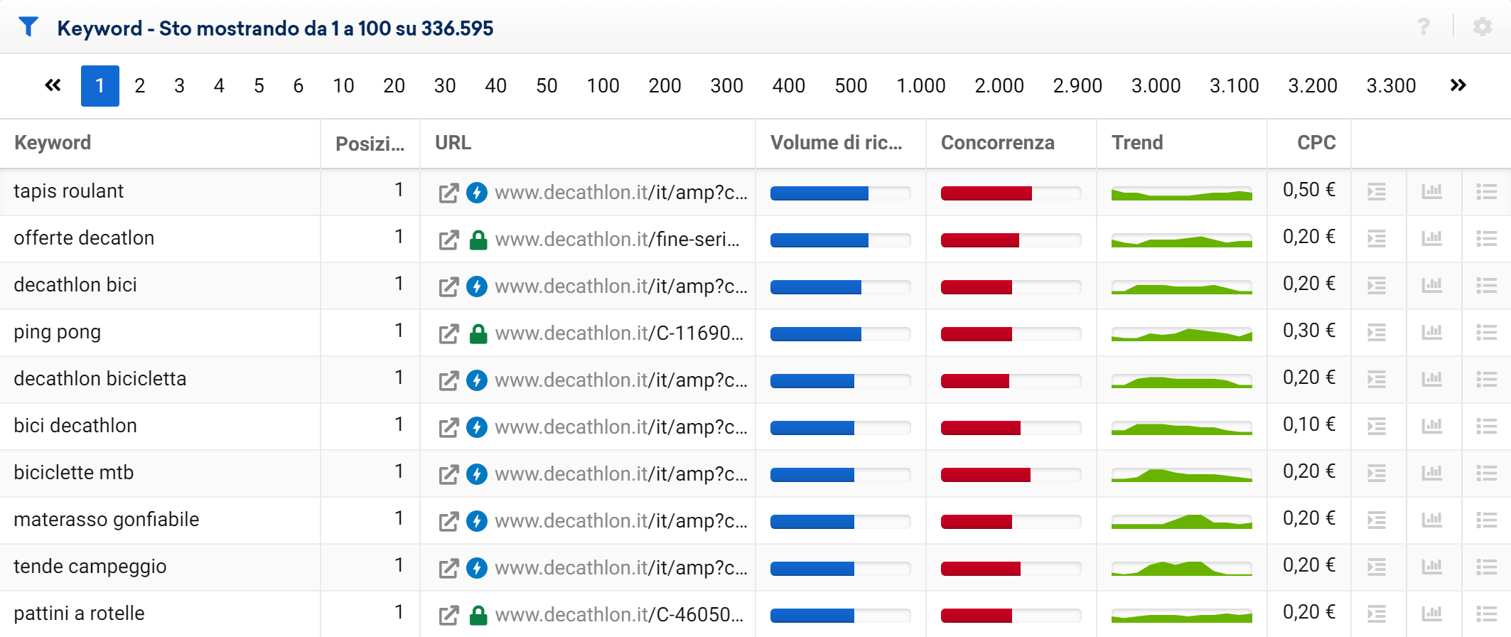 Da impostazione predefinita, nella colonna seguente viene visualizzato anche CPC, non mostrato nell’immagine precedente. Il CPC è il valore del Costo Per Click per quella keyword, e si riferisce al prezzo dei clic per Google Ads: esso può differire a seconda della campagna, ma è un buon modo per capire quanto è costosa una keyword.