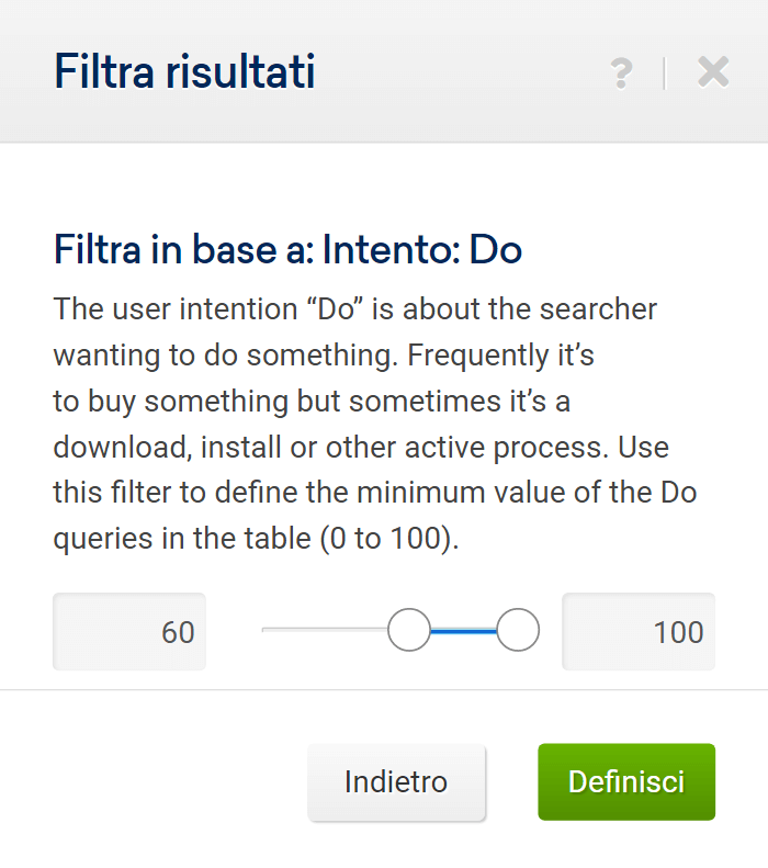 Con il cursore puoi impostare il valore corrispondente dell’intento di ricerca. In altre parole, quanto è forte l’intento di “fare” qualcosa.