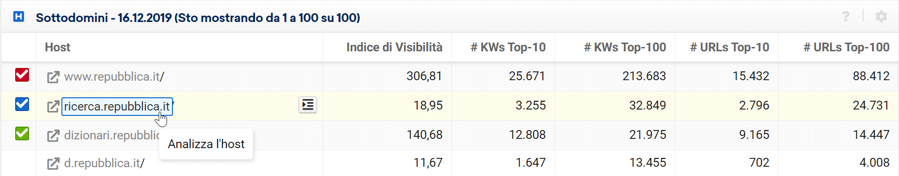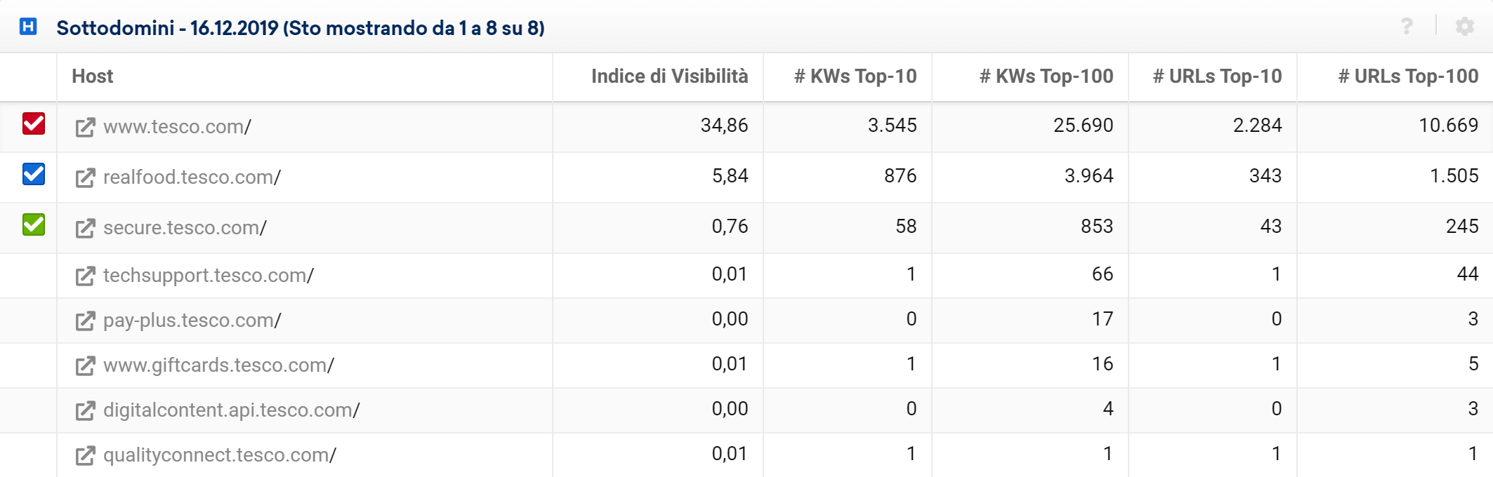 Per ogni sottodominio viene indicato il loro Indice di Visibilità, il numero di keyword posizionate nelle prime 10 (Top-10) e 100 (Top-100) posizioni e la quantità di URL posizionati nelle prime 10 (Top-10) e 100 (Top-100) posizioni.