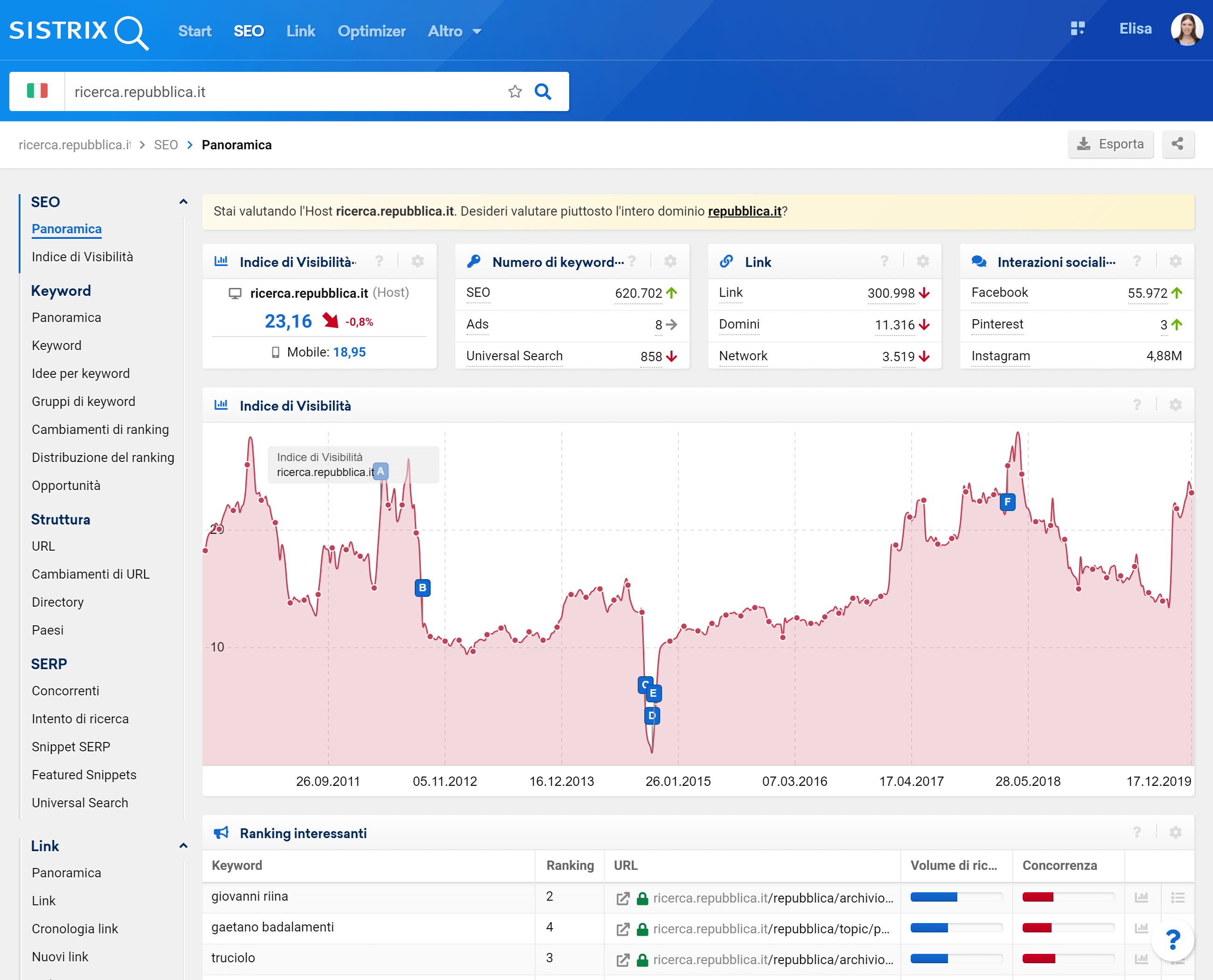Nella pagina di panoramica per il sottodominio potrai vederne i KPI più importanti: il suo Indice di Visibilità, il numero di keyword, il traffico, i link e altri ranking interessanti.